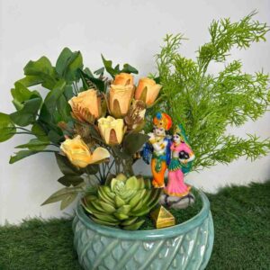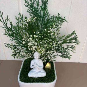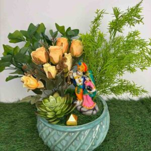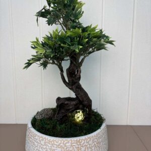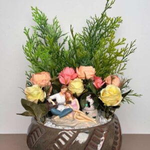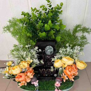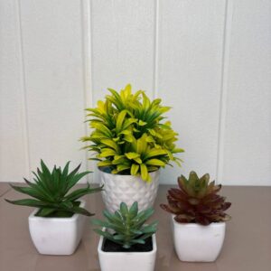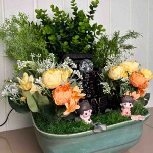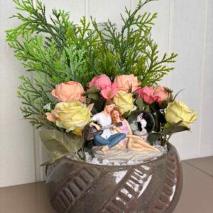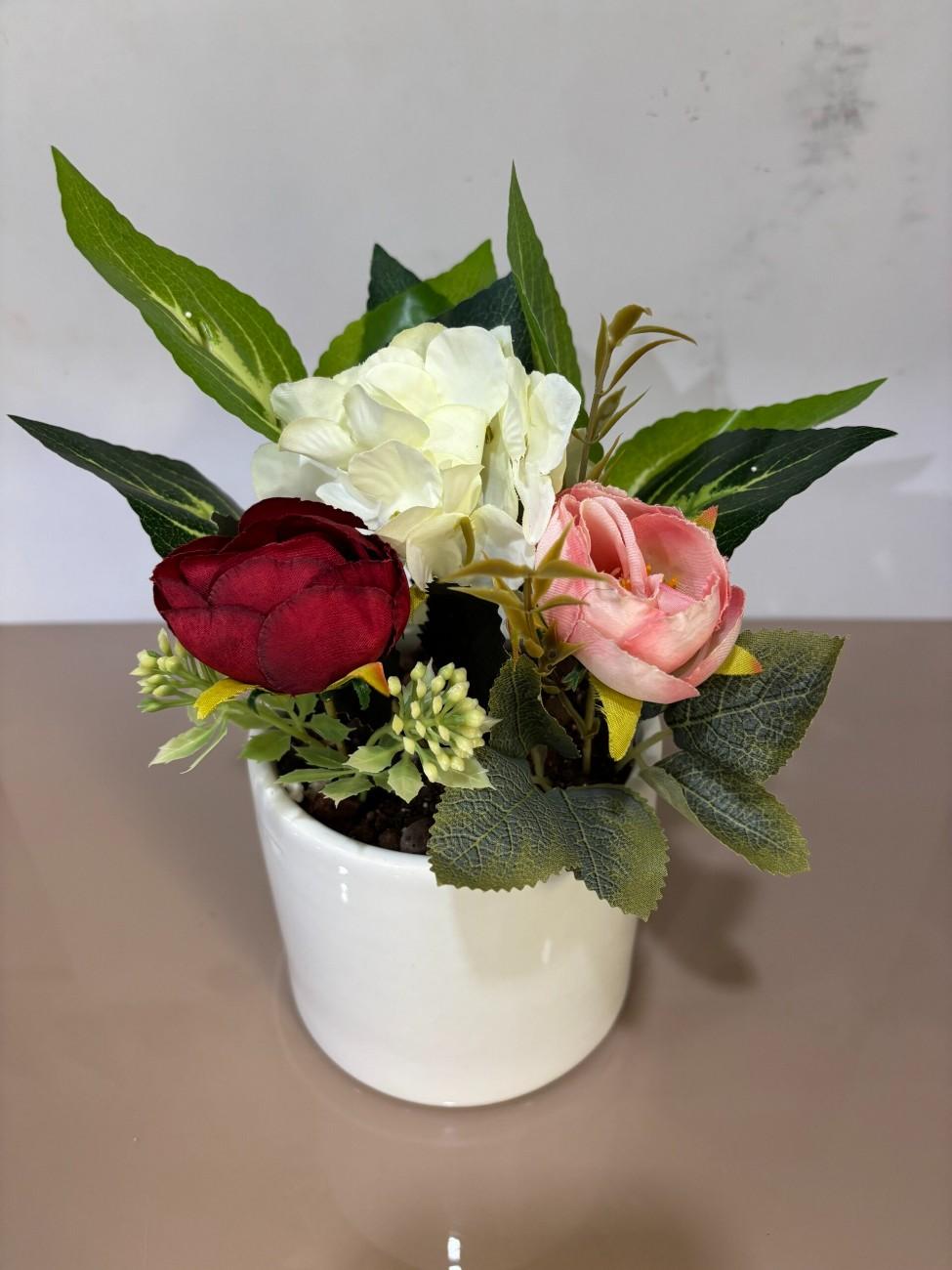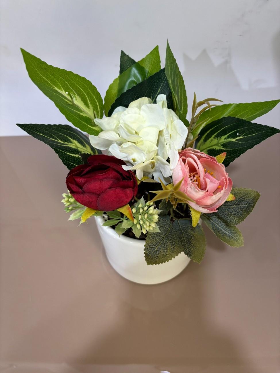 This delightful artificial flower arrangement brings a touch of natural beauty to any corner of your home or office without the need for maintenance. It showcases a beautiful combination of artificial flowers, including a deep burgundy rose, a delicate pink rose, and a fluffy white hydrangea-like bloom, all surrounded by a variety of realistic green leaves and small accent flowers.