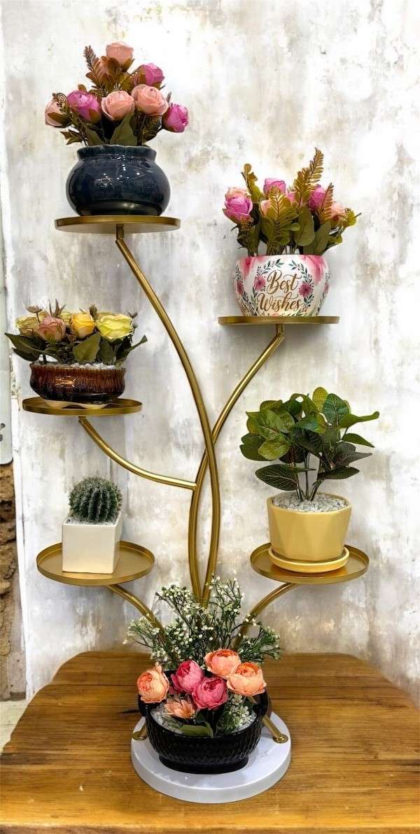 A stylish golden tree-style stand holding six unique artificial plant and flower arrangements in designer pots. Perfect for gifting or elegant indoor décor.