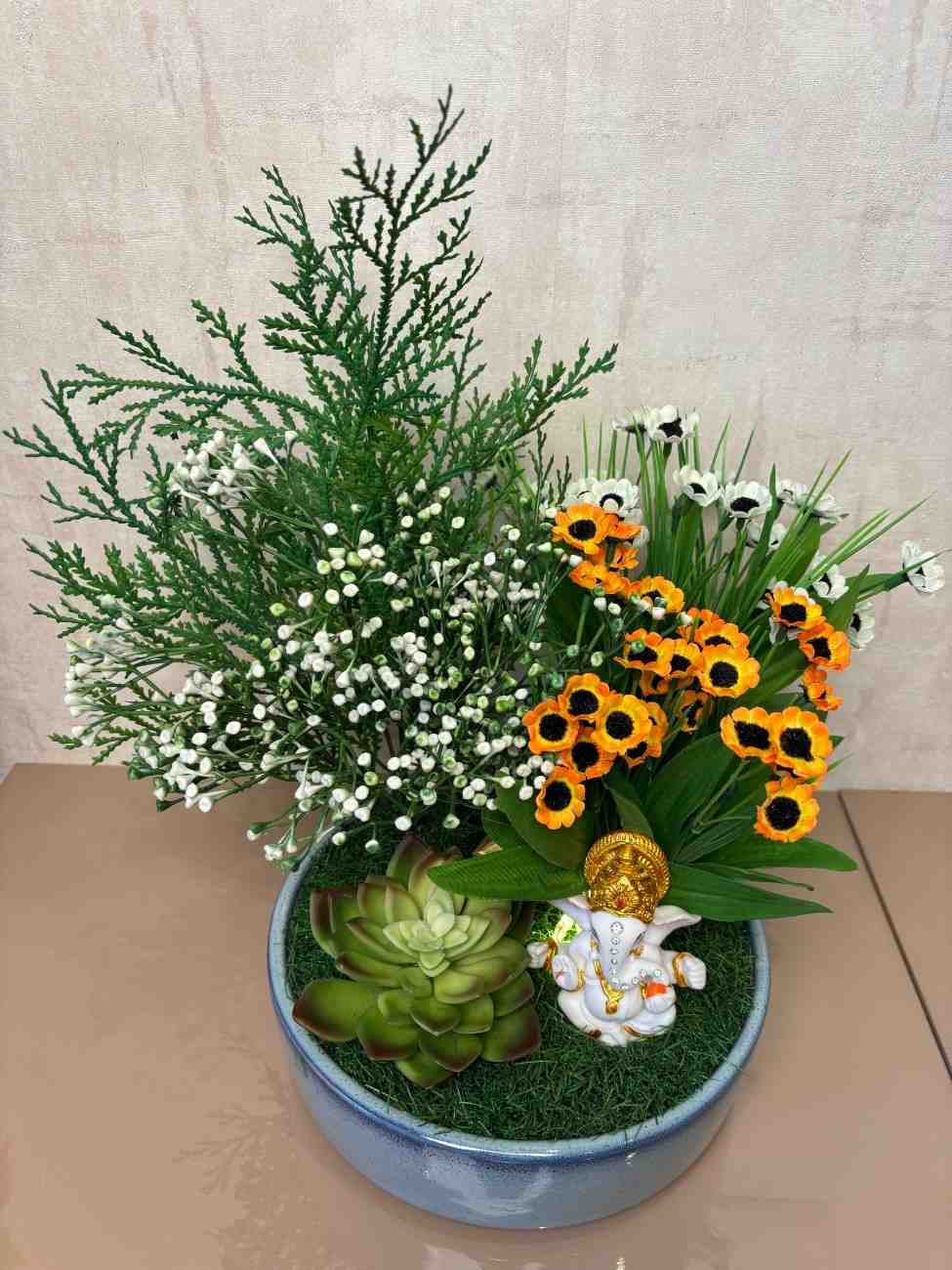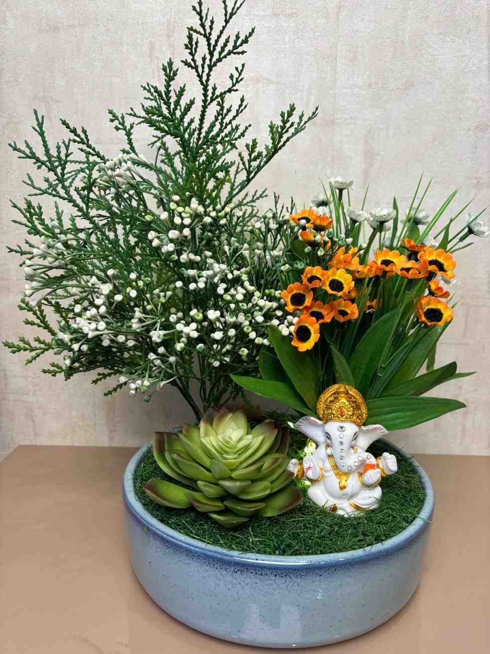 This elegant piece combines faith and freshness in one compact arrangement. It features a high-quality artificial plant setup with white berry stems, yellow-orange flowers, green foliage, and a realistic succulent. At the center sits a beautifully crafted white Ganesha idol with golden detailing, all presented in a glossy sky-blue ceramic pot.