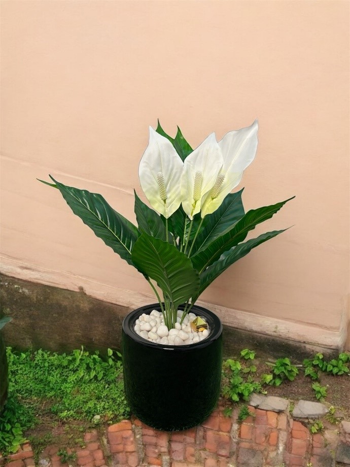 Bring calm and class to your interiors with this stunning artificial peace lily plant, featuring realistic green leaves and elegant white blossoms. The glossy black ceramic pot paired with natural-looking white stones creates a luxurious look — all without the hassle of watering or sunlight.