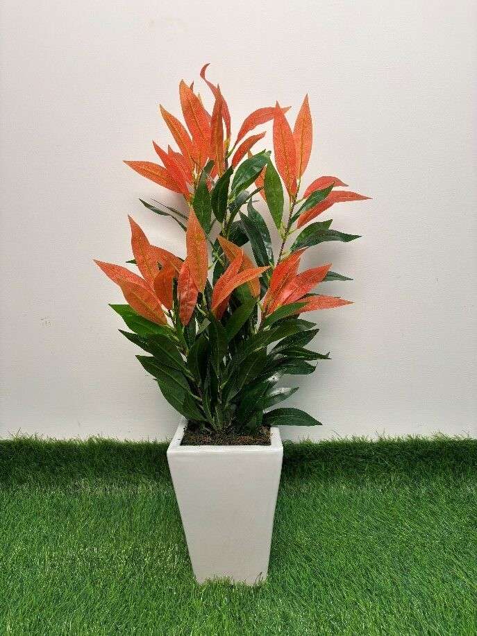 Add a splash of color to your interiors with this artificial Red Tip Photinia plant. Featuring lifelike green and red-orange foliage, this decorative piece stands tall in a modern, tapered white ceramic planter. Ideal for entryways, office corners, living rooms, or balconies where a touch of nature is desired without the maintenance.