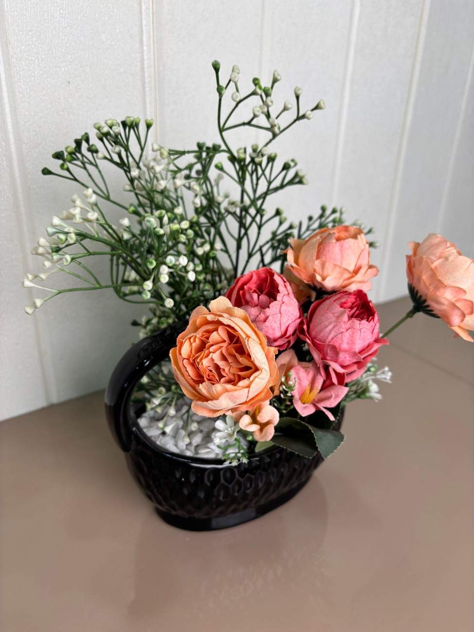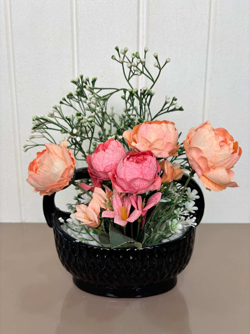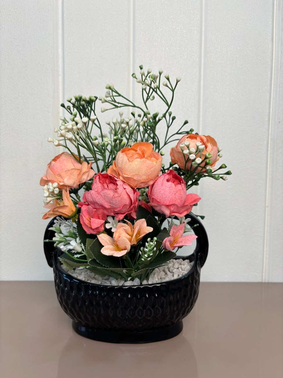 Add a touch of elegance to your space with this vibrant artificial flower arrangement. Featuring delicate roses in shades of peach and pink, accented with white filler flowers and green foliage, this piece is placed in a glossy black textured ceramic pot with white decorative stones. It’s a maintenance-free décor option ideal for homes, offices, and special occasions.