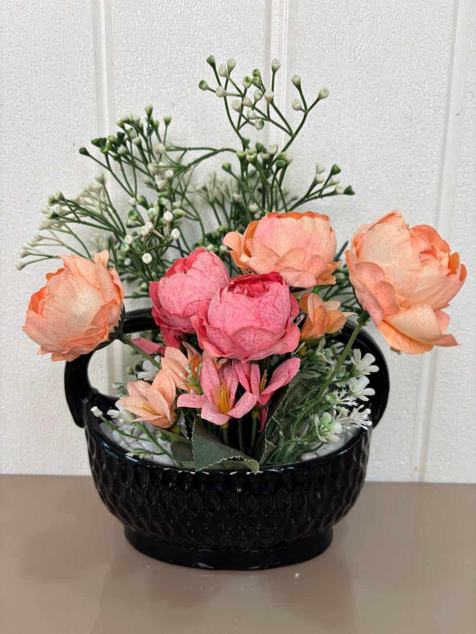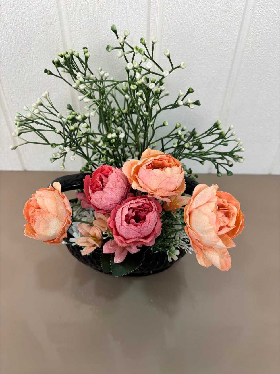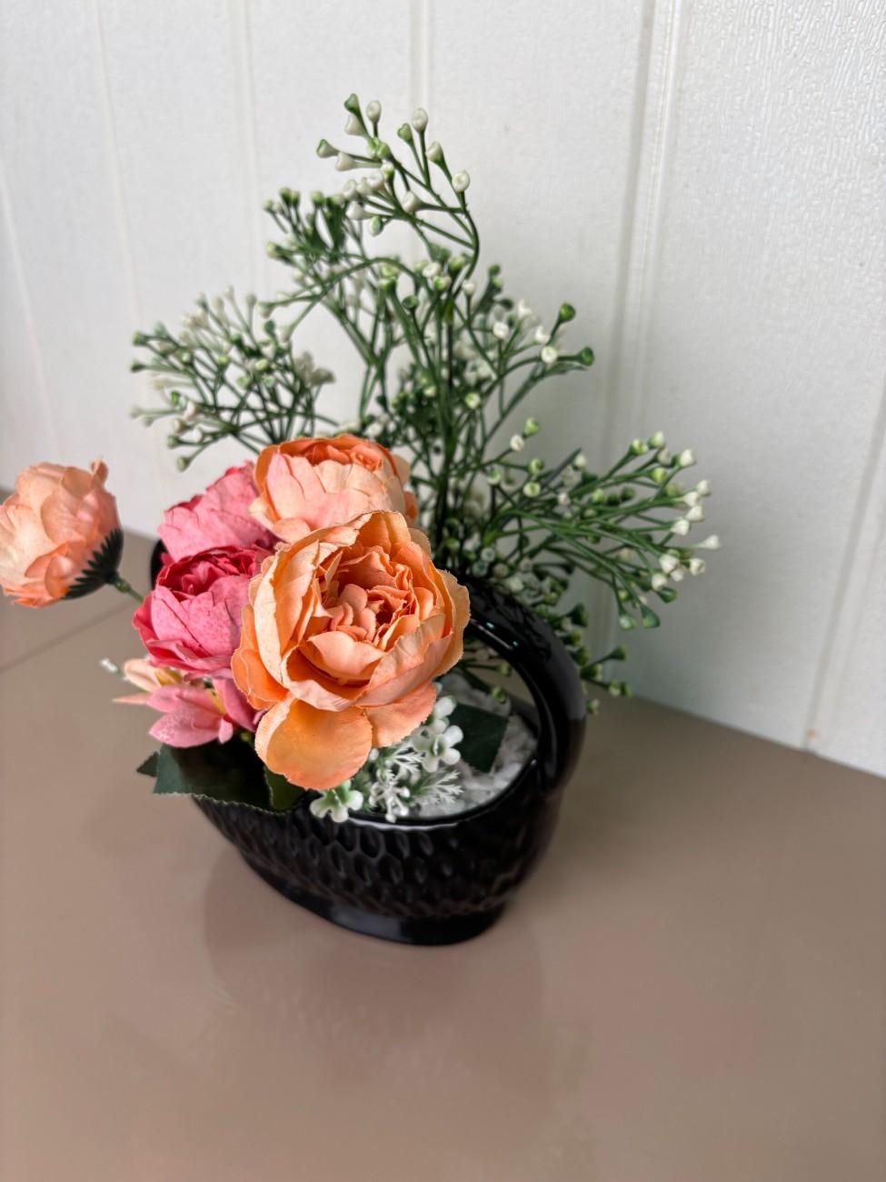 Add a touch of elegance to your space with this vibrant artificial flower arrangement. Featuring delicate roses in shades of peach and pink, accented with white filler flowers and green foliage, this piece is placed in a glossy black textured ceramic pot with white decorative stones. It’s a maintenance-free décor option ideal for homes, offices, and special occasions.