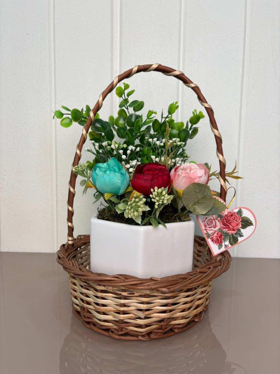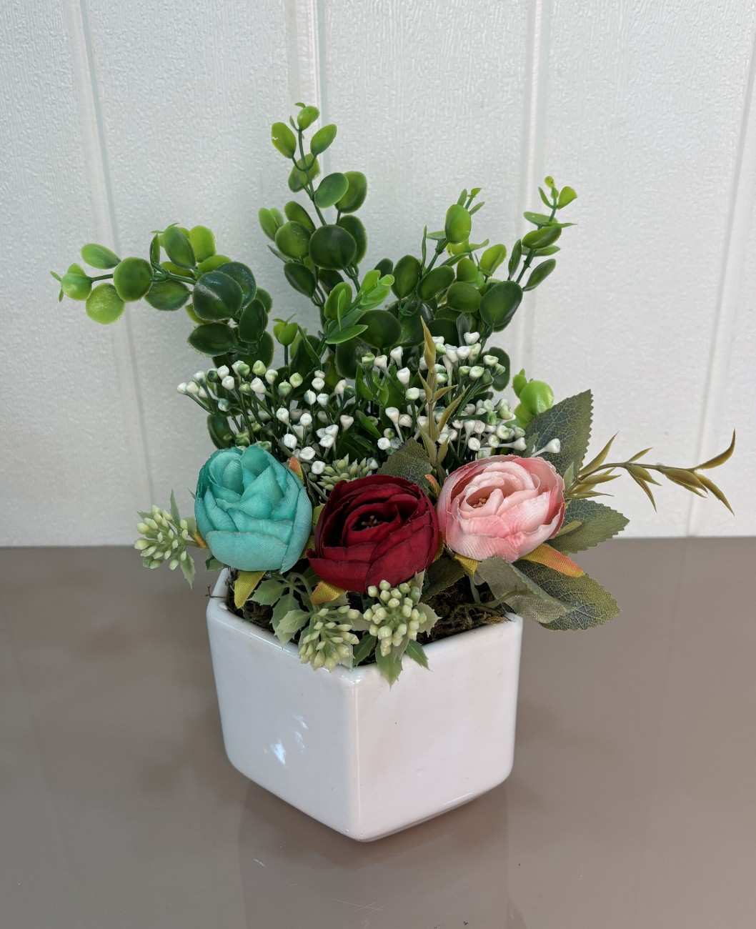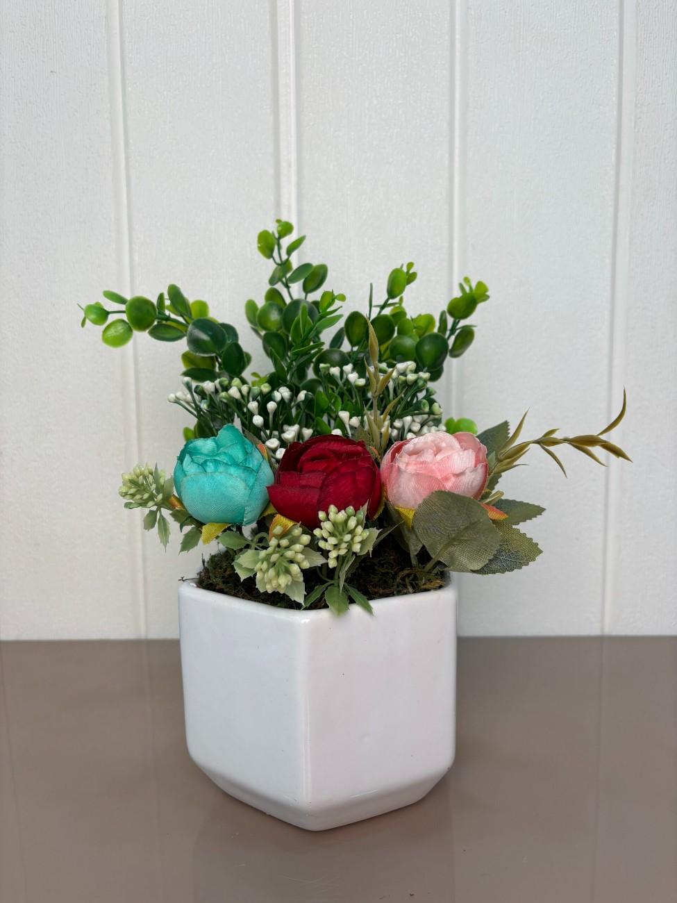 Add a touch of nature to your living space with this elegant artificial flower arrangement. Beautifully crafted with lifelike detail, it features three vibrant rose flowers in red, pink, and turquoise blue, surrounded by lush green leaves and white filler buds. All of this is carefully arranged in a sleek, white ceramic pot, making it perfect for desks, center tables, or shelves.