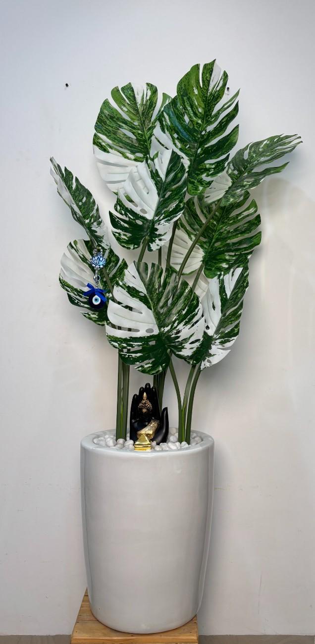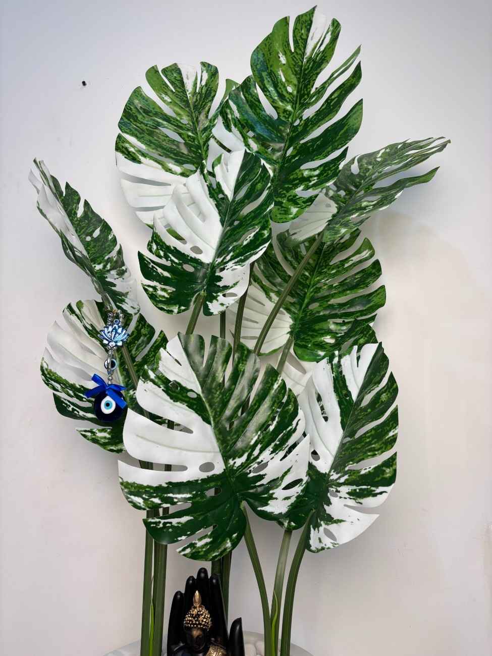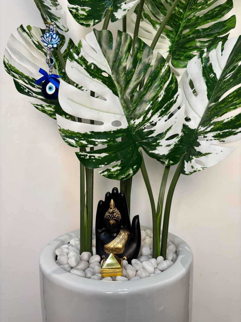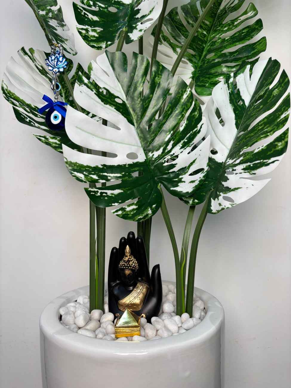 Transform your interiors with this stunning Artificial Variegated Monstera plant, standing tall in a glossy white ceramic pot. The lush dual-toned foliage adds a modern aesthetic, while the Buddha statue and evil eye charm offer balance, protection, and serenity. Ideal for meditation corners, office spaces, or bright reading nooks.