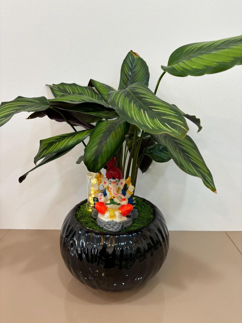 Invite blessings, positive energy, and serene beauty into your space with our Auspicious Ganesha & Calathea Meditation Planter. This exquisitely designed arrangement serves as a powerful symbol of good fortune, wisdom, and success, making it an ideal addition to your pooja room, meditation corner, living area, or office.