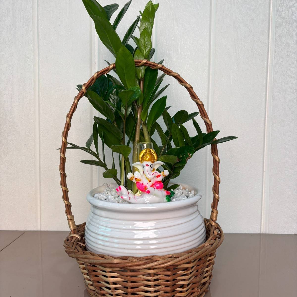 Adding a spiritual touch, a small, colorful idol of Lord Ganesha is gracefully positioned amidst the plant, symbolizing wisdom, good fortune, and the remover of obstacles. The entire ceramic pot is then snugly placed inside a beautifully hand-woven wicker basket with an arched handle, giving the arrangement a rustic, natural, and charming look. A subtle decorative element, possibly a small light feature or clear cylinder, is also present near the Ganesha idol.