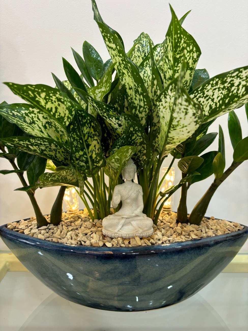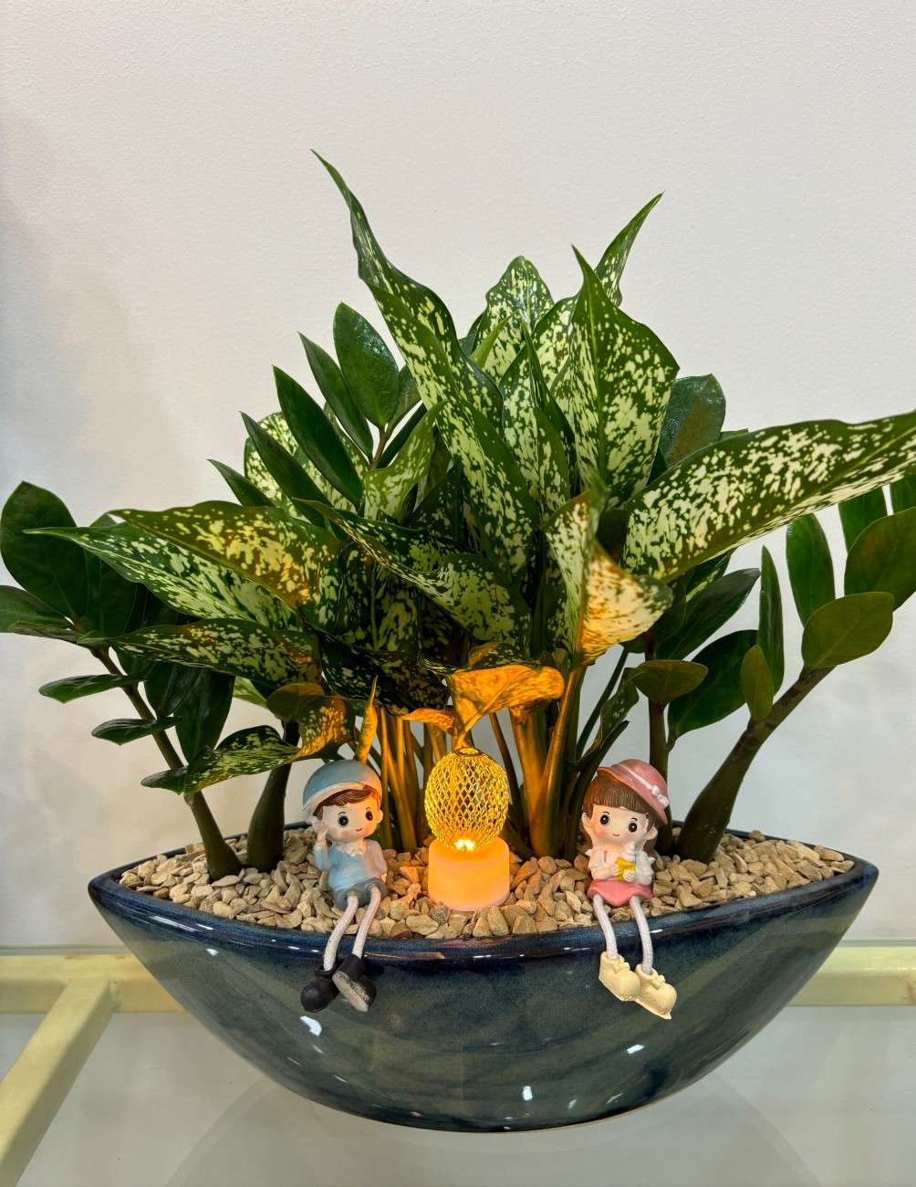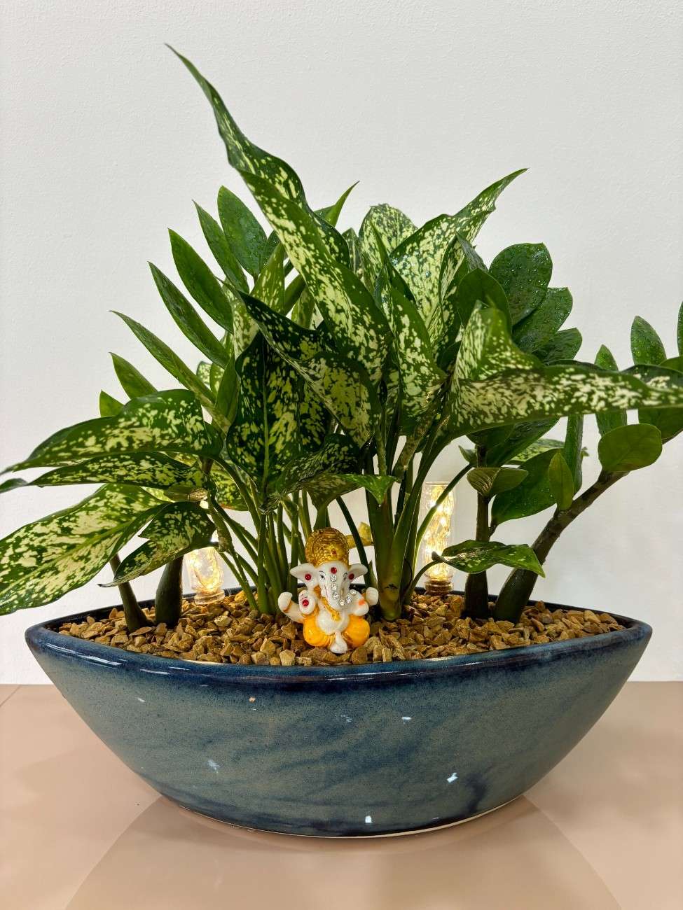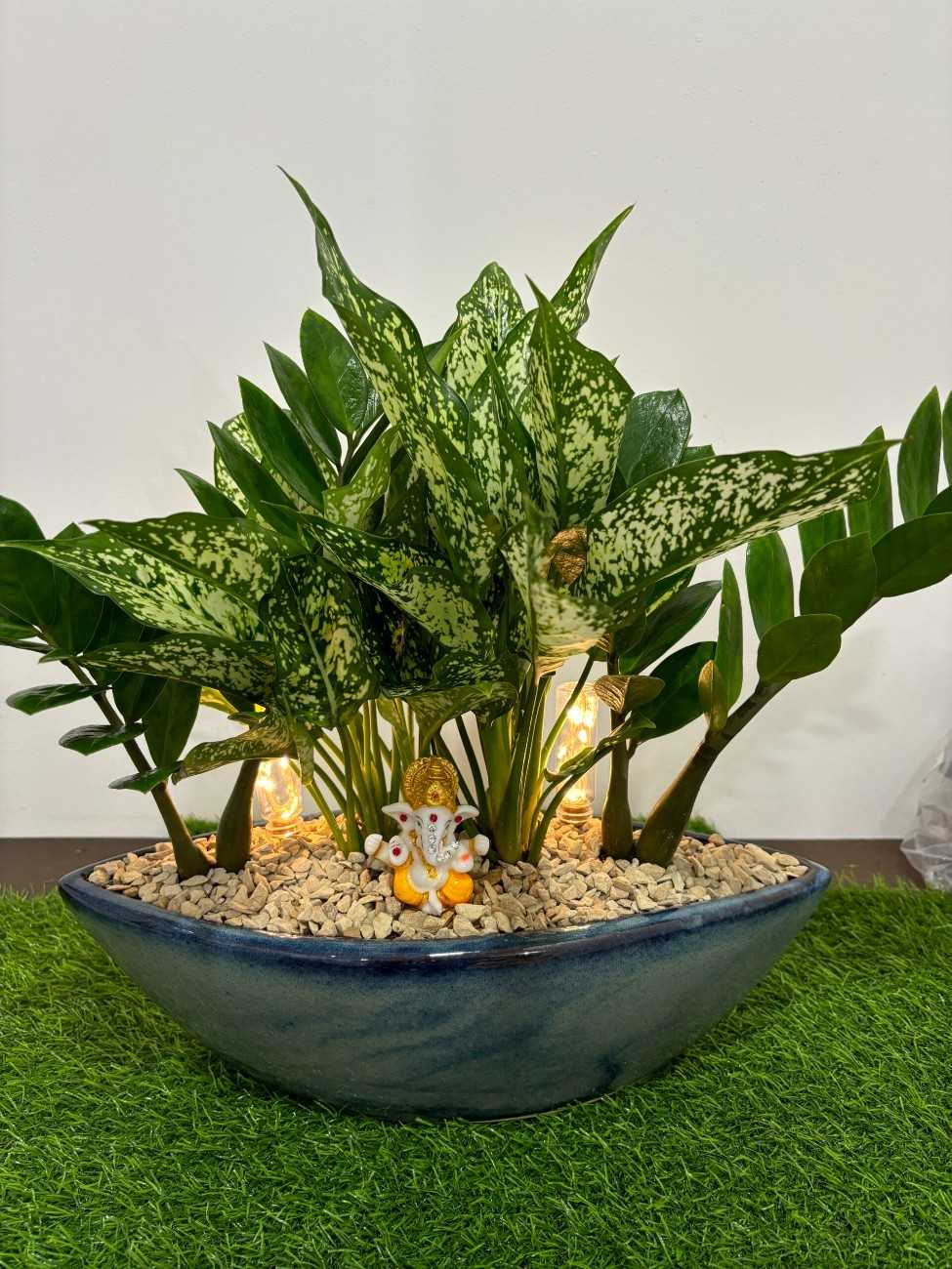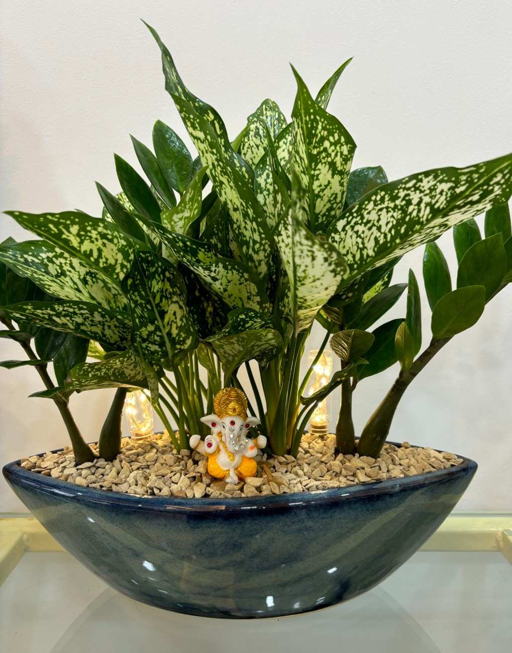 Planted with a vibrant combination of Chinese Aglaonema and ZZ plant, this lush arrangement offers the perfect blend of greenery and good vibes. Both plants are known for their air-purifying properties, easy maintenance, and auspicious presence according to Vastu principles.