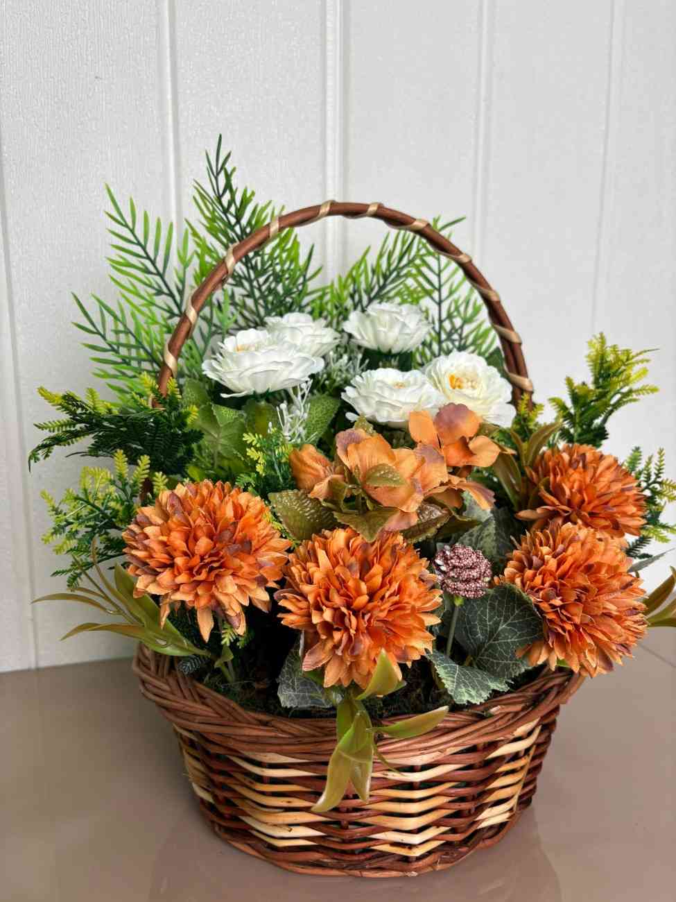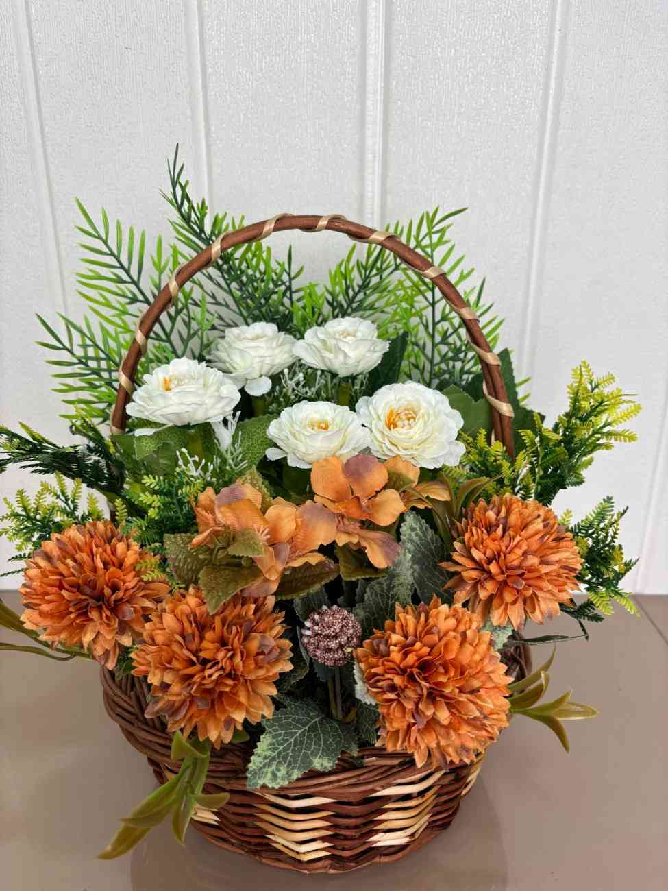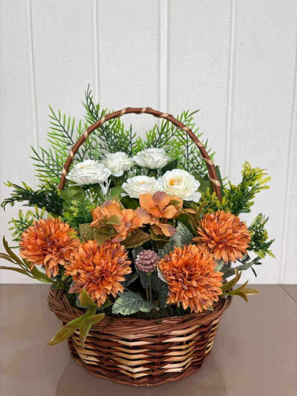 The basket is dominated by several full, textured artificial chrysanthemums in a beautiful burnt orange hue, evoking the vibrant colors of fall foliage. These are elegantly contrasted by soft, pristine white artificial roses nestled amongst them, adding a touch of freshness and balance. The arrangement is further enhanced by a variety of lush green foliage, including feathery fern-like leaves and broader, textured leaves, providing depth and realism. A small, unique textured filler in a muted tone adds an interesting detail.