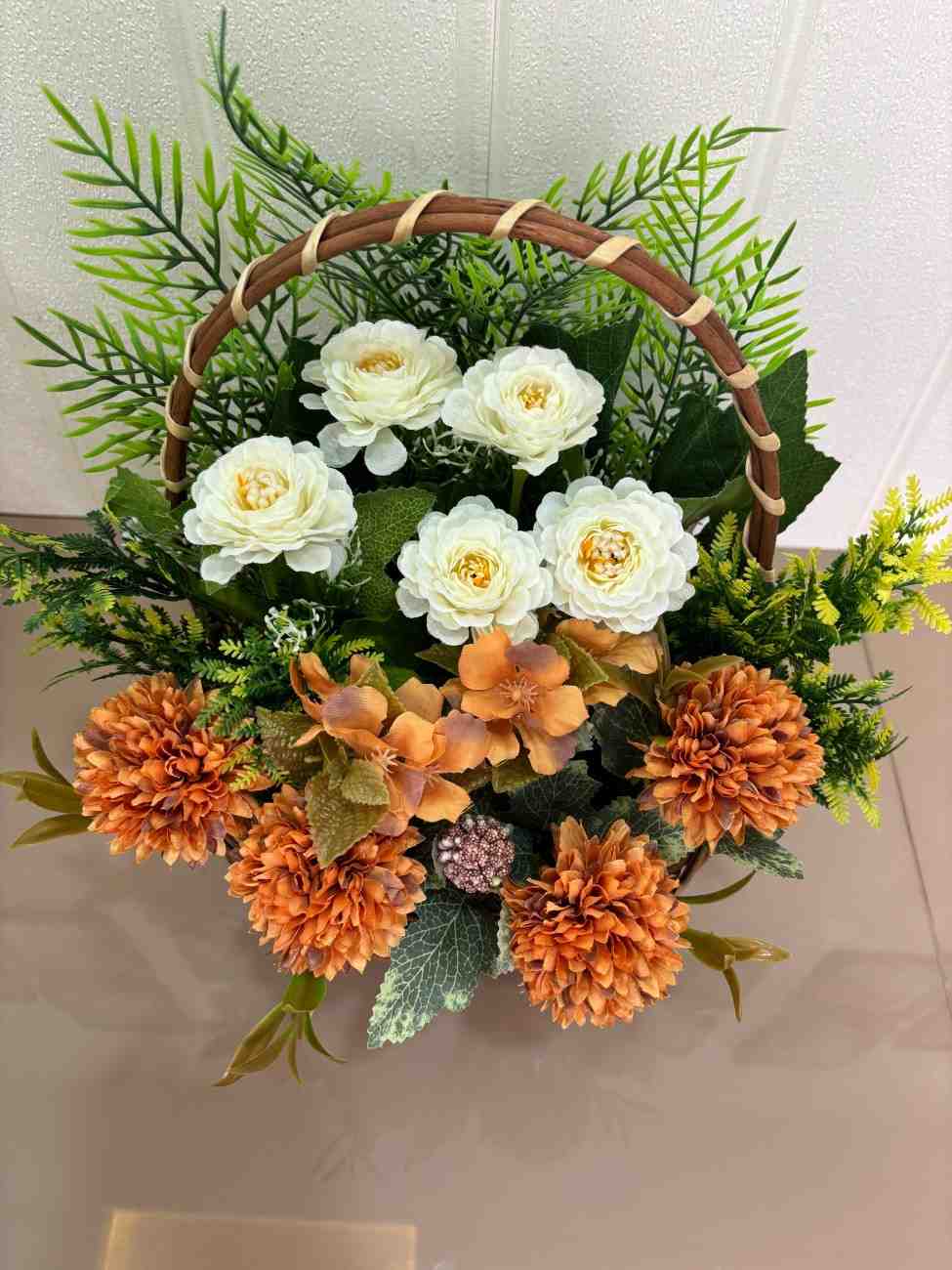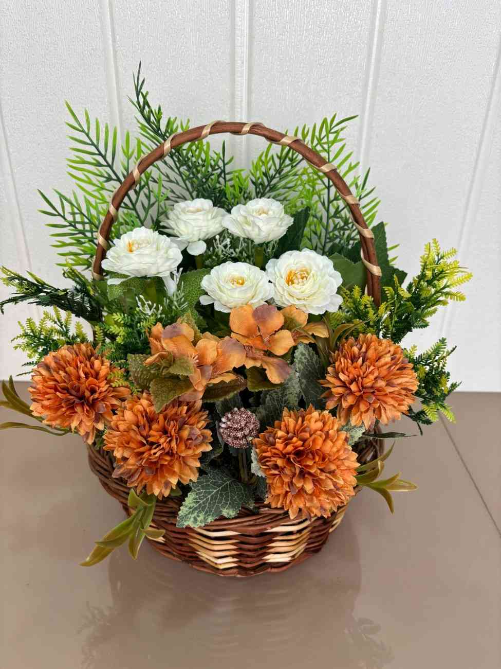 Embrace the cozy warmth of the season with our Autumn Radiance Artificial Flower Basket. This captivating arrangement brings together the rich, earthy tones of autumn with the timeless elegance of white roses, all meticulously crafted from high-quality artificial materials for lasting beauty.