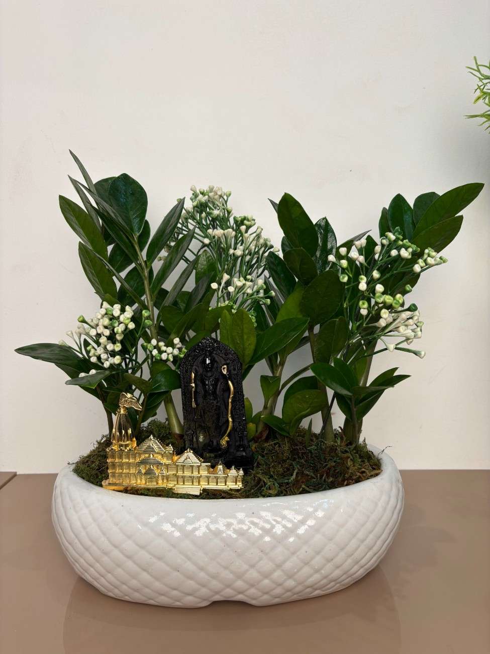 Bring home the divine blessings of Ayodhya with this exquisite indoor plant arrangement. Featuring lush green foliage and delicate white blooms, this planter is adorned with a beautiful idol of Ram Lala and a miniature replica of the Shri Ram Mandir, all nestled in an elegant white ceramic pot. A perfect blend of spirituality, nature, and home decor.