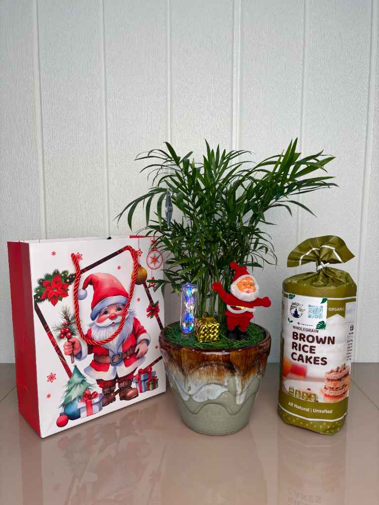 Celebrate the most wonderful time of the year with our “Christmas Cheer Planter & Snack Gift Set.” This all-inclusive holiday package combines the beauty of a live plant with charming festive decor and a delicious, healthy treat, making it an ideal gift for loved ones, colleagues, or as a festive accent for your own home or office.