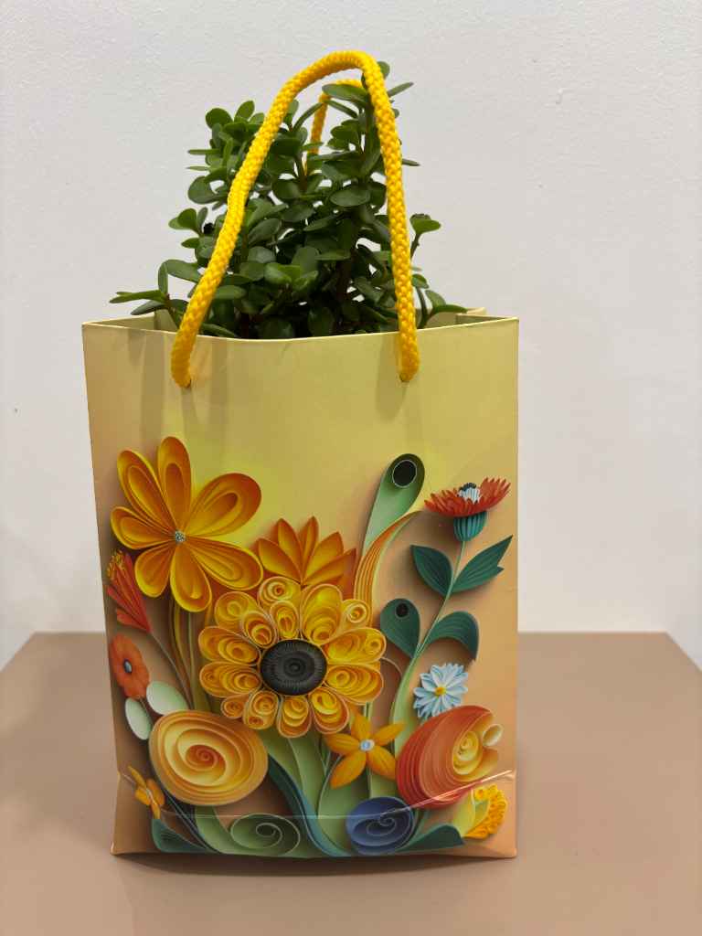 The highlight of this presentation is the stunning gift bag itself, featuring intricate, quilling-style floral artwork in vibrant shades of yellow, orange, and blue. The detailed paper craftsmanship adds a touch of artistic elegance, making the entire gift feel special and unique. This low-maintenance plant thrives indoors and is perfect for desks, shelves, or as a welcoming accent in any living space. It’s an excellent choice for birthdays, housewarmings, corporate gifts, or as a thoughtful gesture to wish someone good luck and prosperity.