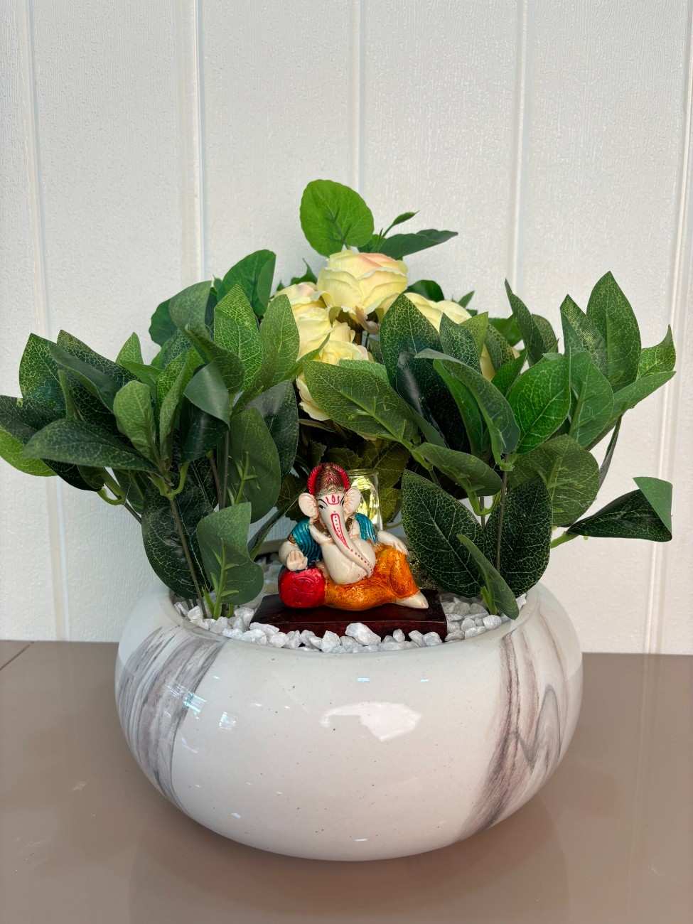 Bring home the blessings of Lord Ganesha with this beautifully arranged artificial plant decor piece. At the center is a charming and colorful Ganesha idol seated gracefully amidst lush green leaves, soft yellow roses, and white decorative pebbles. The setup is placed in a glossy round ceramic planter with a subtle marble texture, offering a modern yet spiritual vibe.