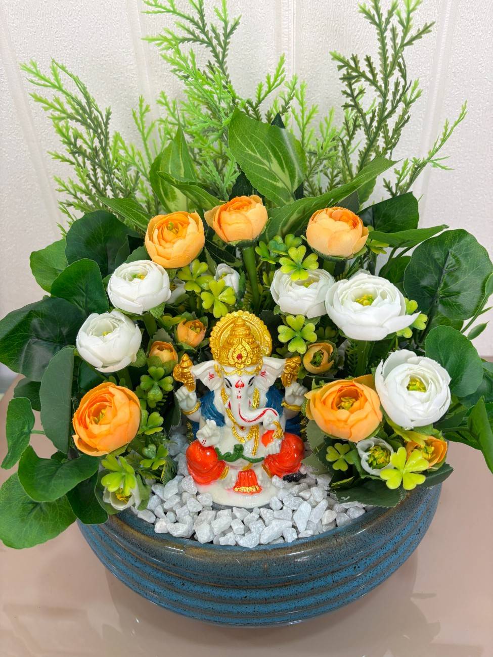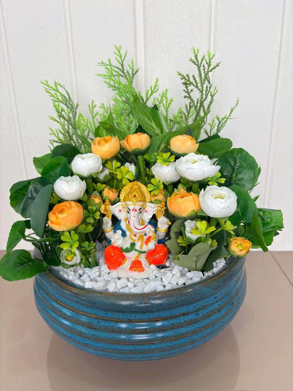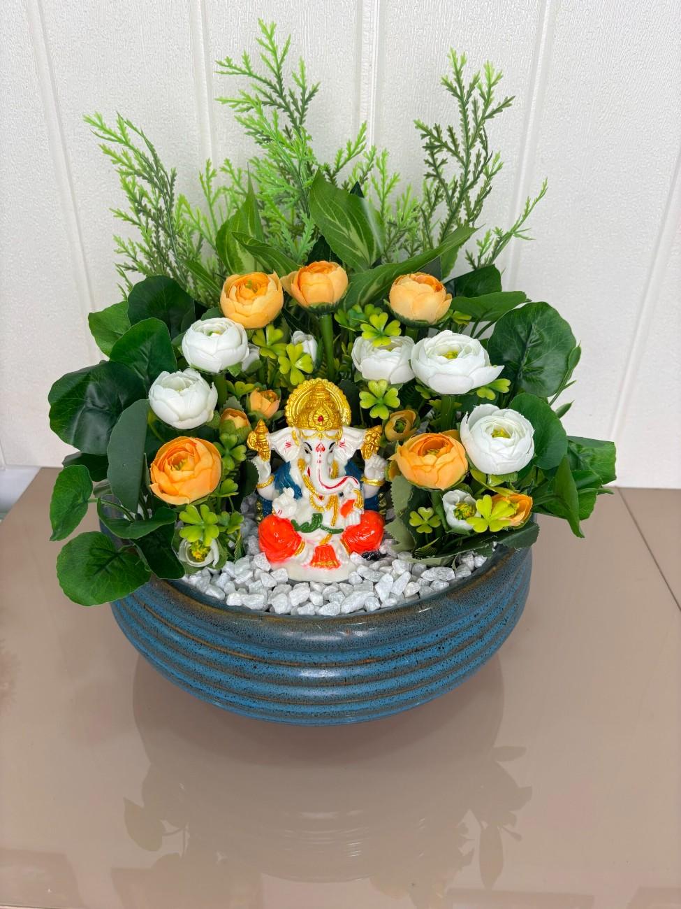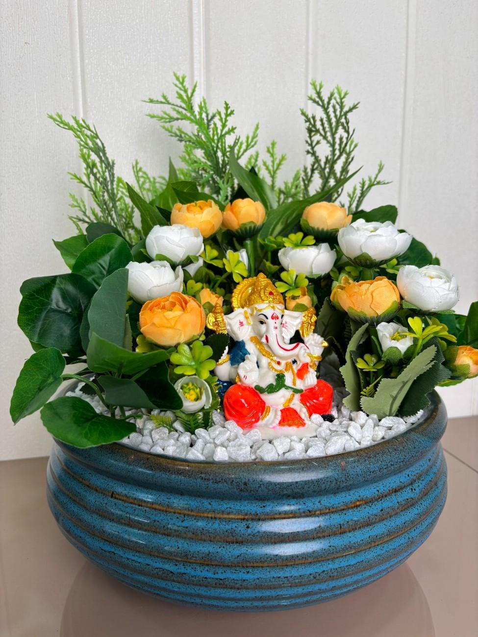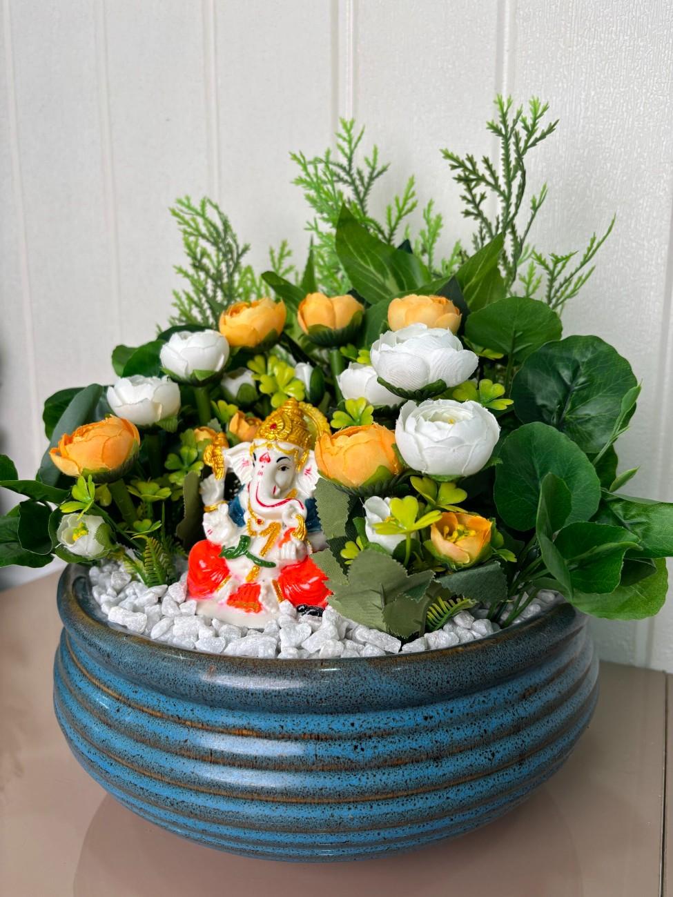 Invite blessings and positive energy into your space with this exquisitely crafted Divine Ganesha & Floral Prosperity Artificial Arrangement. This centerpiece features a charming and colorful idol of Lord Ganesha, seated prominently amidst a vibrant display of artificial flowers in warm orange and pristine white hues. The flowers are complemented by various shades of lush green artificial foliage, including delicate fern-like leaves and broad, leafy accents, creating a natural and inviting backdrop. The entire arrangement rests on a bed of crisp white decorative pebbles, simulating a serene garden. All these elements are beautifully contained within a stylish, round, blue ceramic pot with a distinctive ribbed or grooved texture, adding a touch of rustic elegance. Perfect for spiritual corners, altars, living rooms, or as a thoughtful gift, this maintenance-free arrangement offers lasting beauty and spiritual solace without any upkeep.