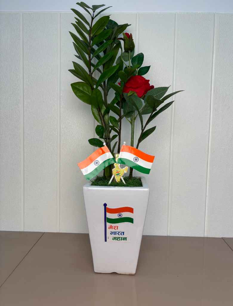 Celebrate the spirit of India with this beautiful and elegant plant pot, specially designed for patriotic occasions like Independence Day (15 August) and Republic Day (26 January). This lovely ZZ plant comes in a pristine white pot featuring the vibrant Indian national flag and the heartwarming message “Mera Bharat: Mahaan” (My India: Great). Adorned with two miniature Indian flags and a striking red rose, this plant makes a perfect decorative piece for your home, office, or as a thoughtful gift. It symbolizes pride, unity, and the rich heritage of our nation. Easy to maintain and long-lasting, it’s a beautiful way to show your love for India.