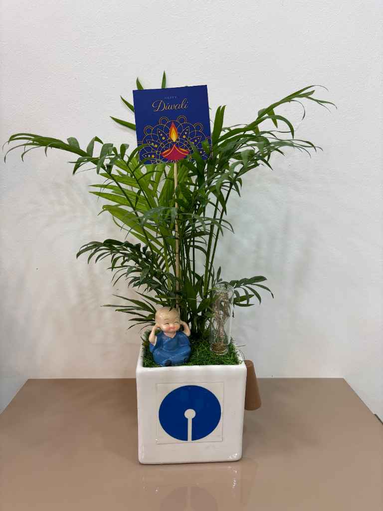 The entire arrangement is housed in a sleek, square white ceramic pot, which features a prominent blue SBI (State Bank of India) logo, making it an excellent choice for corporate branding and events. A “Happy Diwali” card is thoughtfully placed within the arrangement, adding a personalized festive greeting.