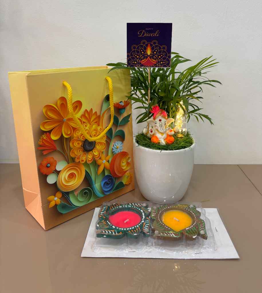 The centerpiece of this hamper is a healthy and easy-to-care-for Parlor Palm (Chamaedorea elegans), renowned for its graceful foliage and air-purifying qualities, presented in a stylish white ceramic pot. The plant is adorned with a charming Lord Ganesh idol, symbolizing new beginnings and wisdom, alongside subtle LED lights that add a warm, inviting glow. A “Happy Diwali” pick is also included to convey your heartfelt wishes.