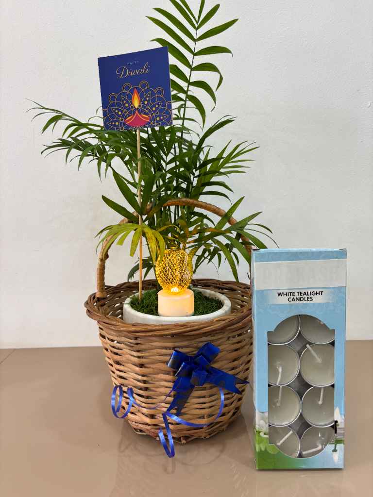 Celebrate Diwali with this thoughtful gift basket featuring a lush parlor palm plant, a festive “Happy Diwali” pick, and a box of white tealight candles, all presented in a charming wicker basket. Perfect for spreading festive cheer and good vibes.