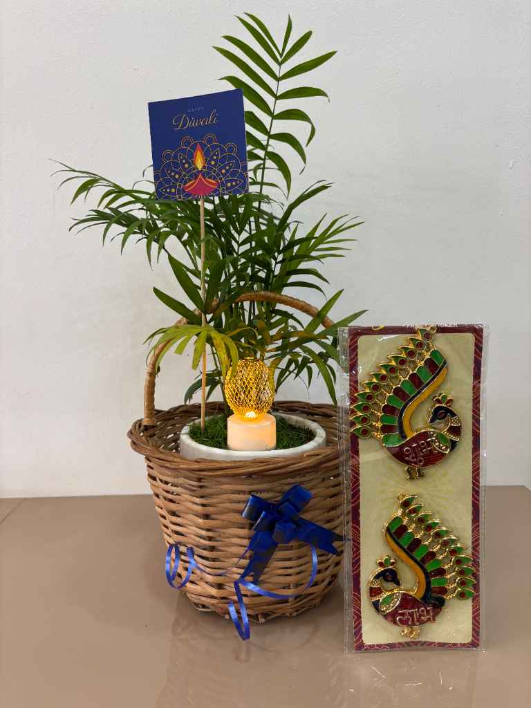 Bring prosperity and light into any home this Diwali with our beautiful and thoughtfully curated gift basket! The centerpiece is a healthy and graceful Parlor Palm (Chamaedorea elegans), a popular indoor plant known for its air-purifying qualities and ease of care. The plant is potted in a white ceramic pot and placed inside an elegant woven wicker basket, adorned with a festive blue ribbon.