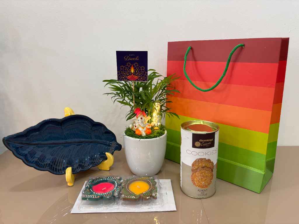 The hamper further delights with a tin of premium, delicious cookies (likely Shreemaya, as seen on the tin), perfect for sharing festive treats. For traditional Diwali lighting, a set of two colorful decorative Diyas is included, ideal for illuminating homes and adding to the festive ambiance. A unique, two-toned (yellow and grey) leaf-shaped ceramic platter, perfect for holding sweets, diyas, or other festive decor, completes this auspicious gift set. All these wonderful items are thoughtfully arranged and presented in a striking, multi-colored striped gift bag with a green handle, making it a ready-to-present and memorable gift this Diwali season.