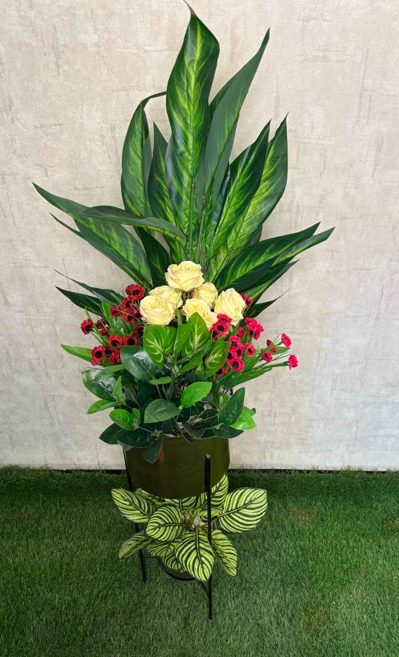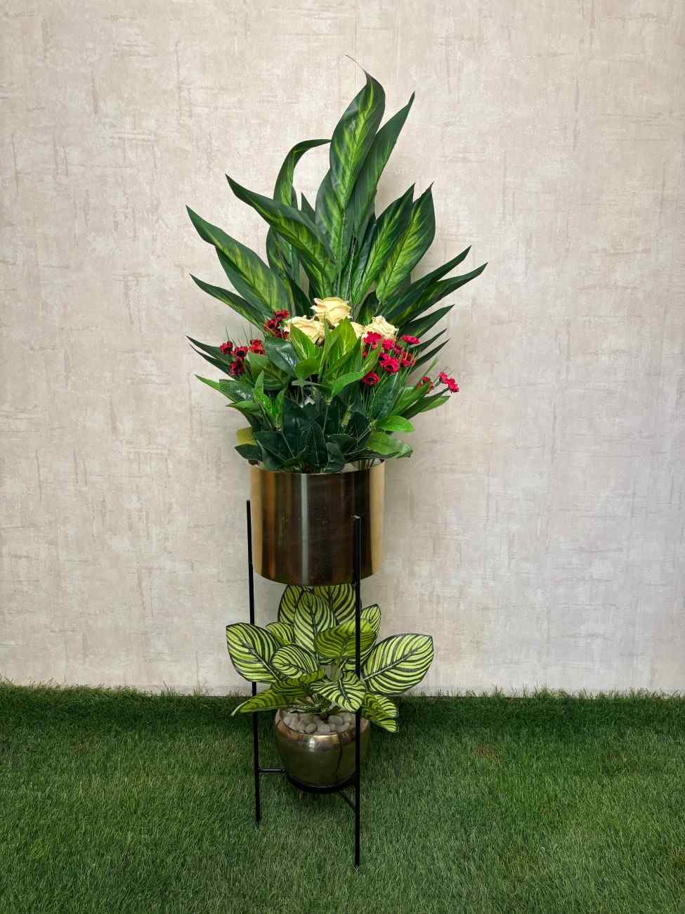 Add a touch of greenery and sophistication to your décor with this double-layer artificial plant arrangement. The upper level features mixed artificial greens with yellow roses and red blooms in a golden metallic pot. The lower level holds a broad-leaf Calathea-style plant in a ceramic pot filled with pebbles, all elegantly mounted on a sleek black iron stand.