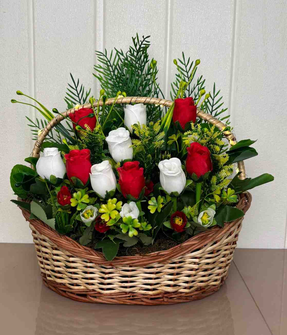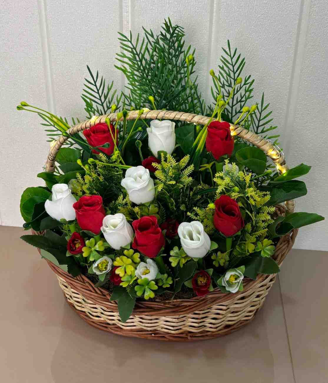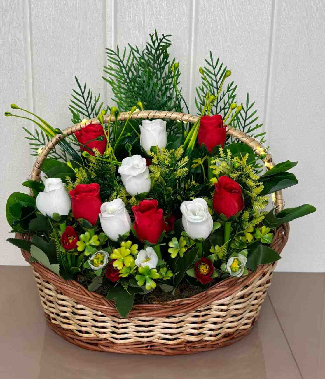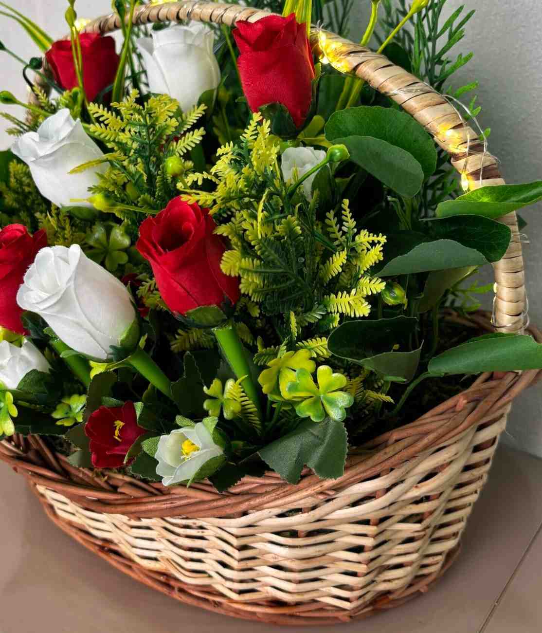 This exquisite artificial floral arrangement offers the enduring beauty of fresh flowers without any of the upkeep. It showcases a harmonious blend of vibrant red and pure white artificial roses, artfully nestled amidst a rich mix of various green foliage and delicate filler flowers, creating a full and inviting display. The entire arrangement is securely set within a sturdy, handcrafted woven basket with a convenient handle, making it a complete and ready-to-display decorative piece. Some variations of this product may also feature subtle, integrated LED lighting along the basket handle, adding a warm, ambient glow to any space. Ideal for enhancing the ambiance of living rooms, dining tables, offices, or as a heartfelt gift for any occasion.