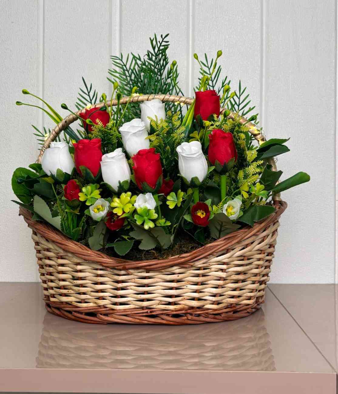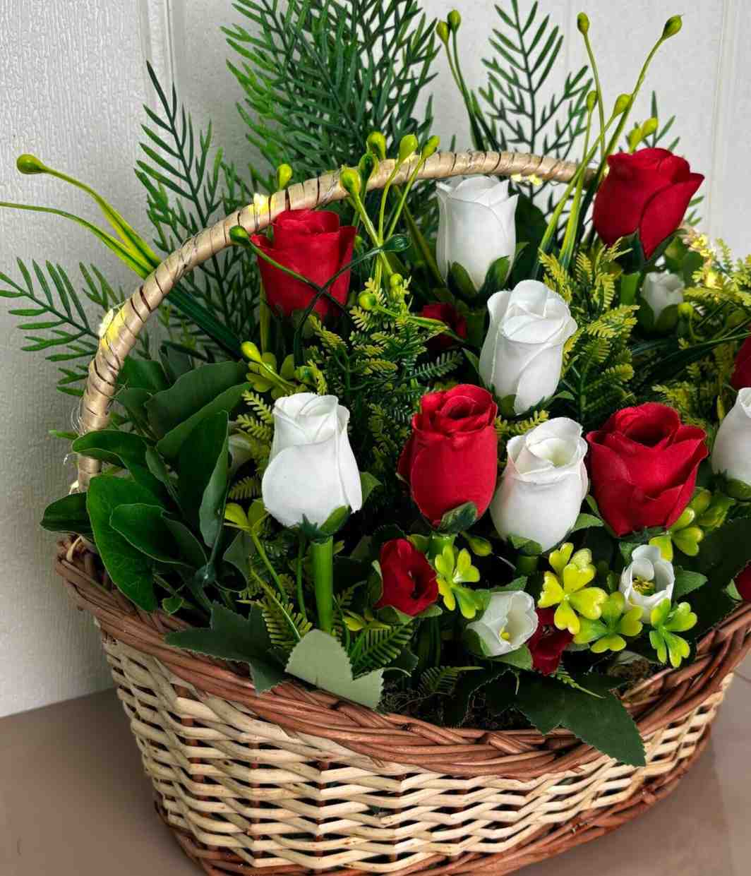 A timeless artificial floral arrangement featuring striking red and classic white roses, complemented by diverse green foliage, all beautifully presented in a charming natural woven basket, with optional integrated subtle lighting.