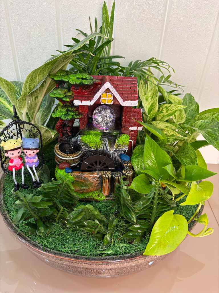 The centerpiece of this detailed garden is a delightful miniature mill house, complete with a red roof and brick-like texture, featuring a crystal ball that lights up and a water wheel that turns as water gently cascades into a small basin. The soothing sound of the flowing water adds a therapeutic element to the visual beauty.