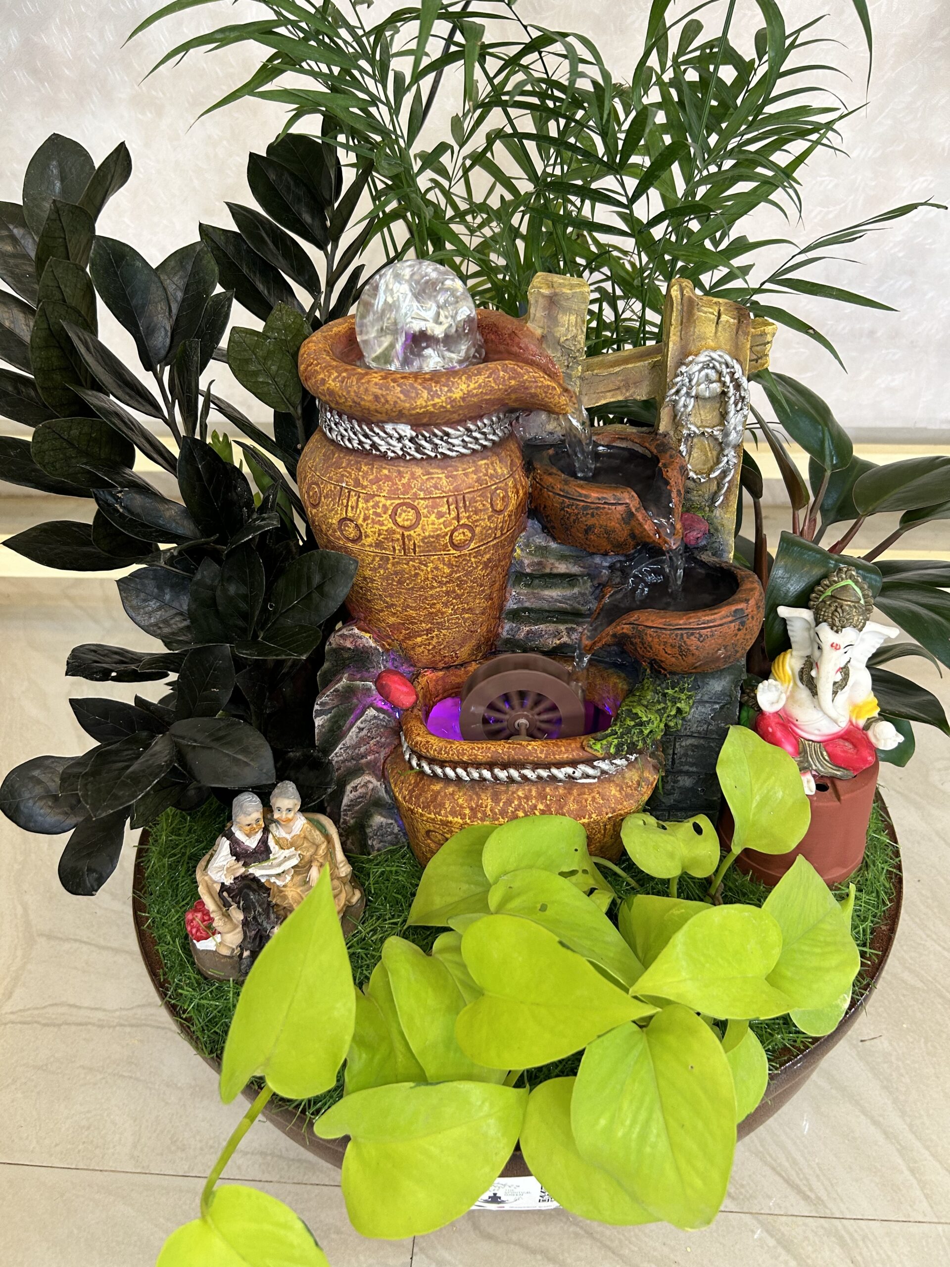 Alongside the fountain, a revered Lord Ganesha idol sits serenely, symbolizing wisdom, prosperity, and good fortune. Adding a touch of heartwarming sentiment are charming figurines of an elderly couple, depicting love and companionship.