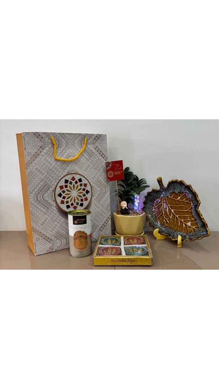 Small Box of Decorative Items (Likely Coasters or Diyas): Next to the plant, there’s a small rectangular box containing four individual items. These appear to be either ornate coasters or small decorative lamps (diyas), given their design. The colors on the box suggest they are vibrant and decorative.