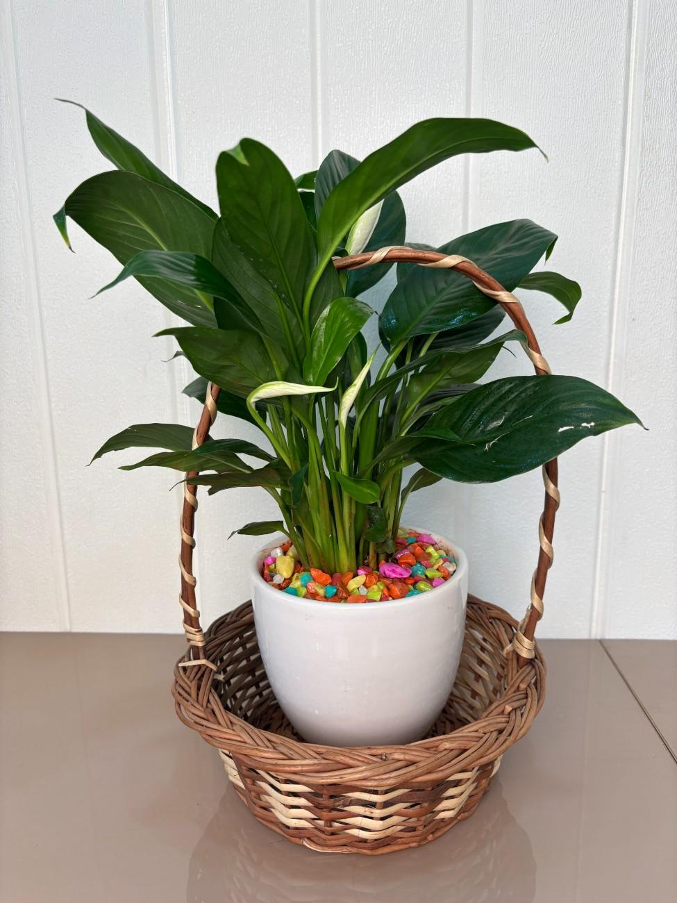 The Peace Lily is cherished for its elegant dark green foliage and distinctive white “flowers” (spathes), as well as its well-known ability to purify indoor air. This charming planter enhances its natural beauty with a playful burst of color from multi-colored pebbles, while the woven wicker basket adds a touch of rustic sophistication, making it an ideal gift or a stunning addition to any decor.