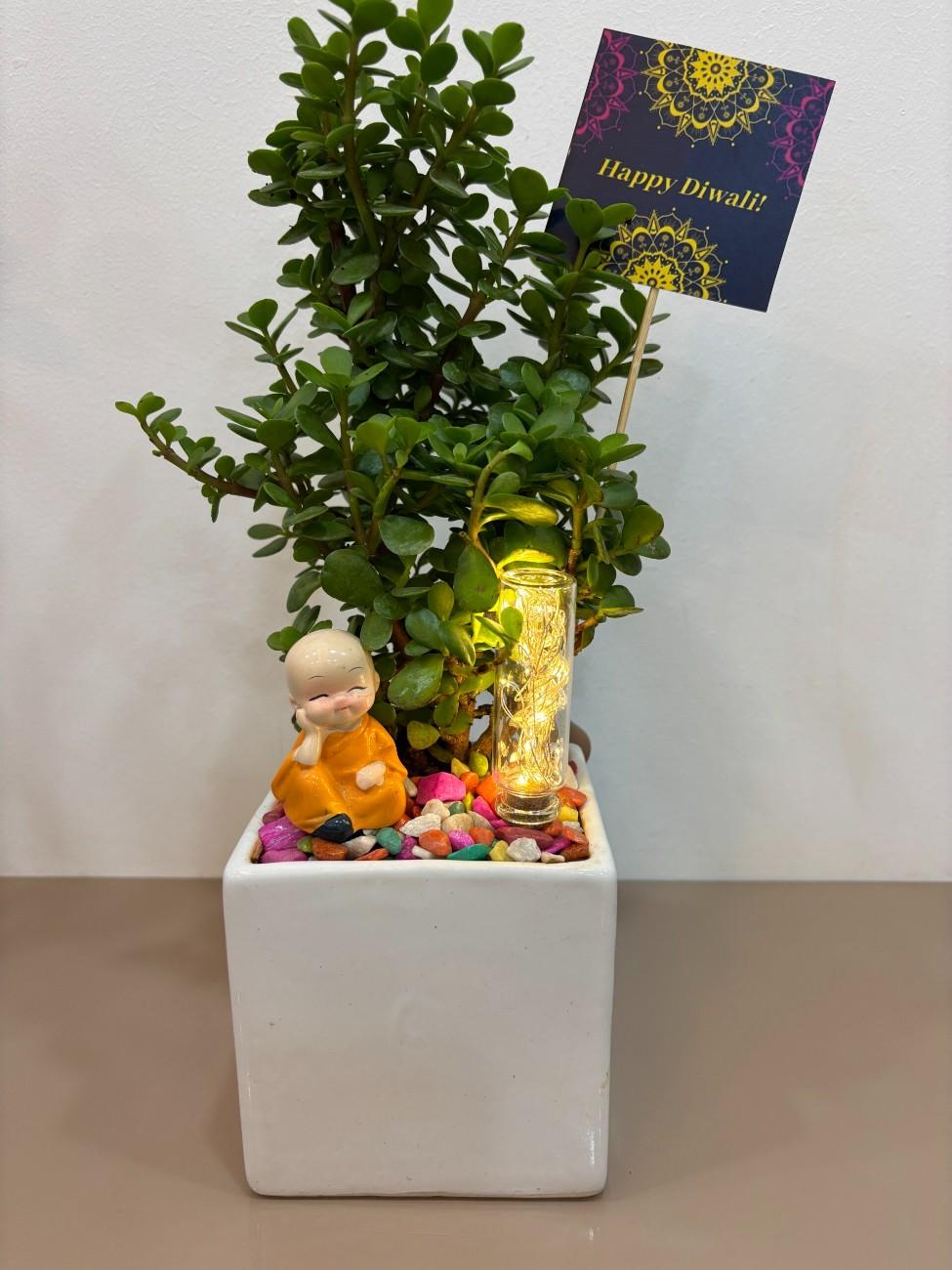 Accompanying the plant is an adorable monk idol, exuding a sense of peace and tranquility. A string of warm LED lights is nestled within the plant, creating a soft, festive glow, perfect for illuminating your celebrations. The entire setup is housed in a modern, white square ceramic pot, providing a clean and contemporary look. The pot’s surface is adorned with colorful decorative pebbles, adding a playful touch. To complete the festive theme, a “Happy Diwali!” card with a beautiful mandala design is included. This product is a thoughtful and auspicious gift for family, friends, or colleagues during Diwali.