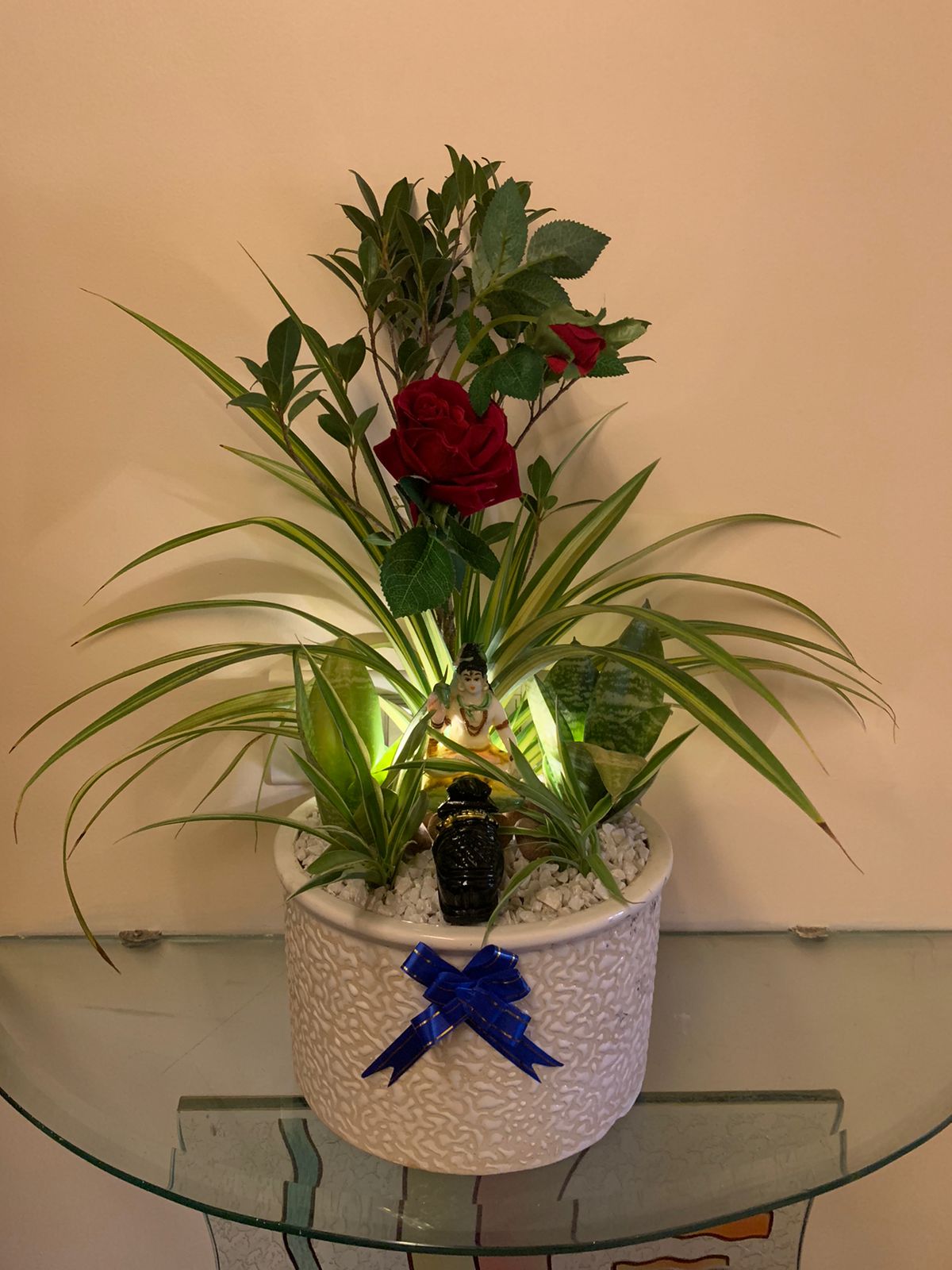 A spiritually inspired tabletop garden featuring Lord Krishna seated near a black Shivling idol, elegantly surrounded by vibrant greens and warm light. The white textured ceramic pot adds a refined, premium feel.