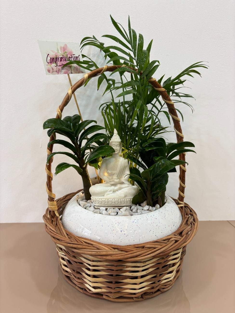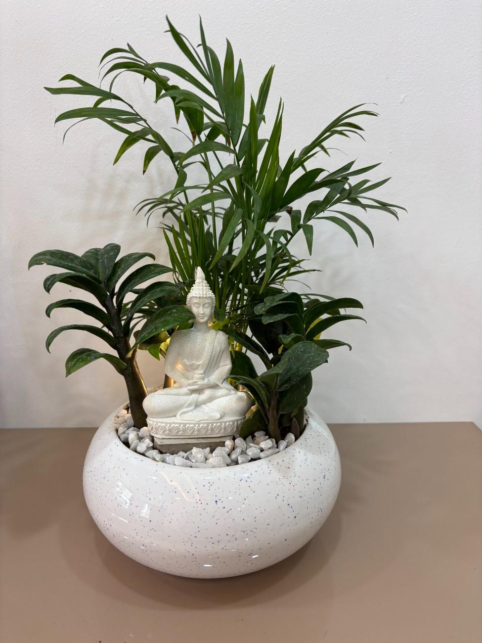 At the heart of this serene display is a beautifully crafted white Buddha statue in a classic meditative pose, embodying peace, mindfulness, and enlightenment. The Buddha is gracefully surrounded by a selection of lush, vibrant live indoor plants, chosen for their visual appeal and ease of care: