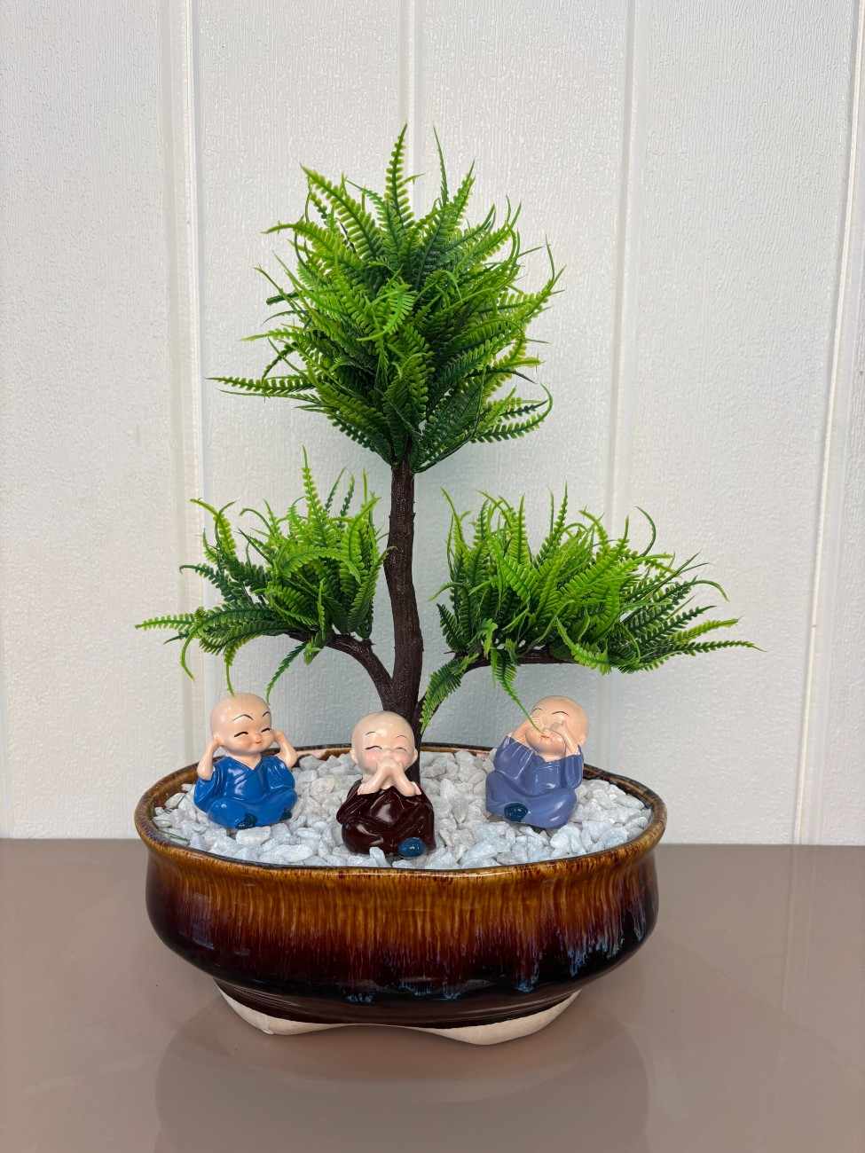 Bring peace, serenity, and elegance to your home or office with this beautiful artificial bonsai plant featuring three adorable monk figurines in meditative poses. Set in a glossy ceramic-style brown pot with white decorative stones, this miniature plant is perfect for adding a spiritual and tranquil touch to any space.
