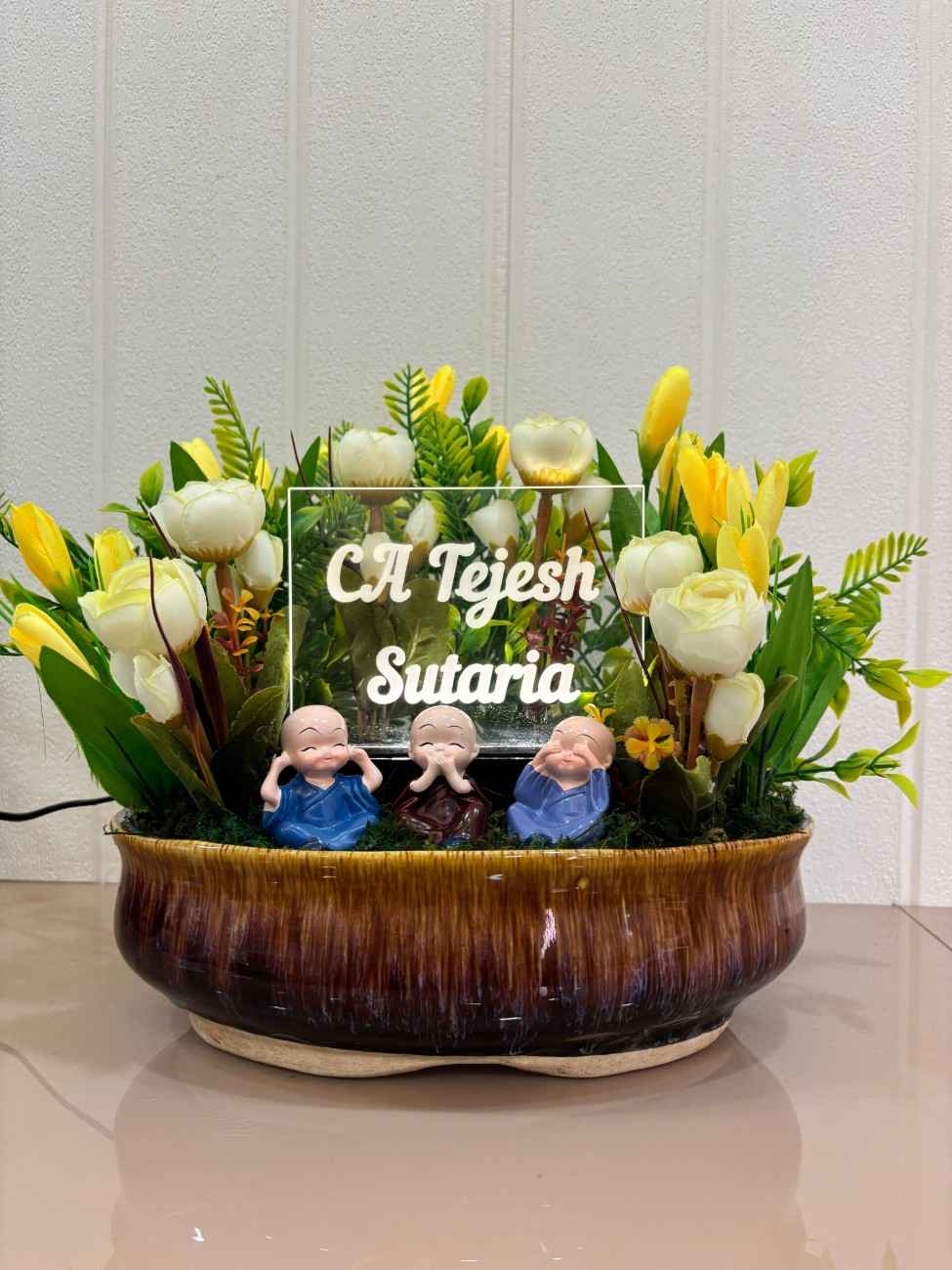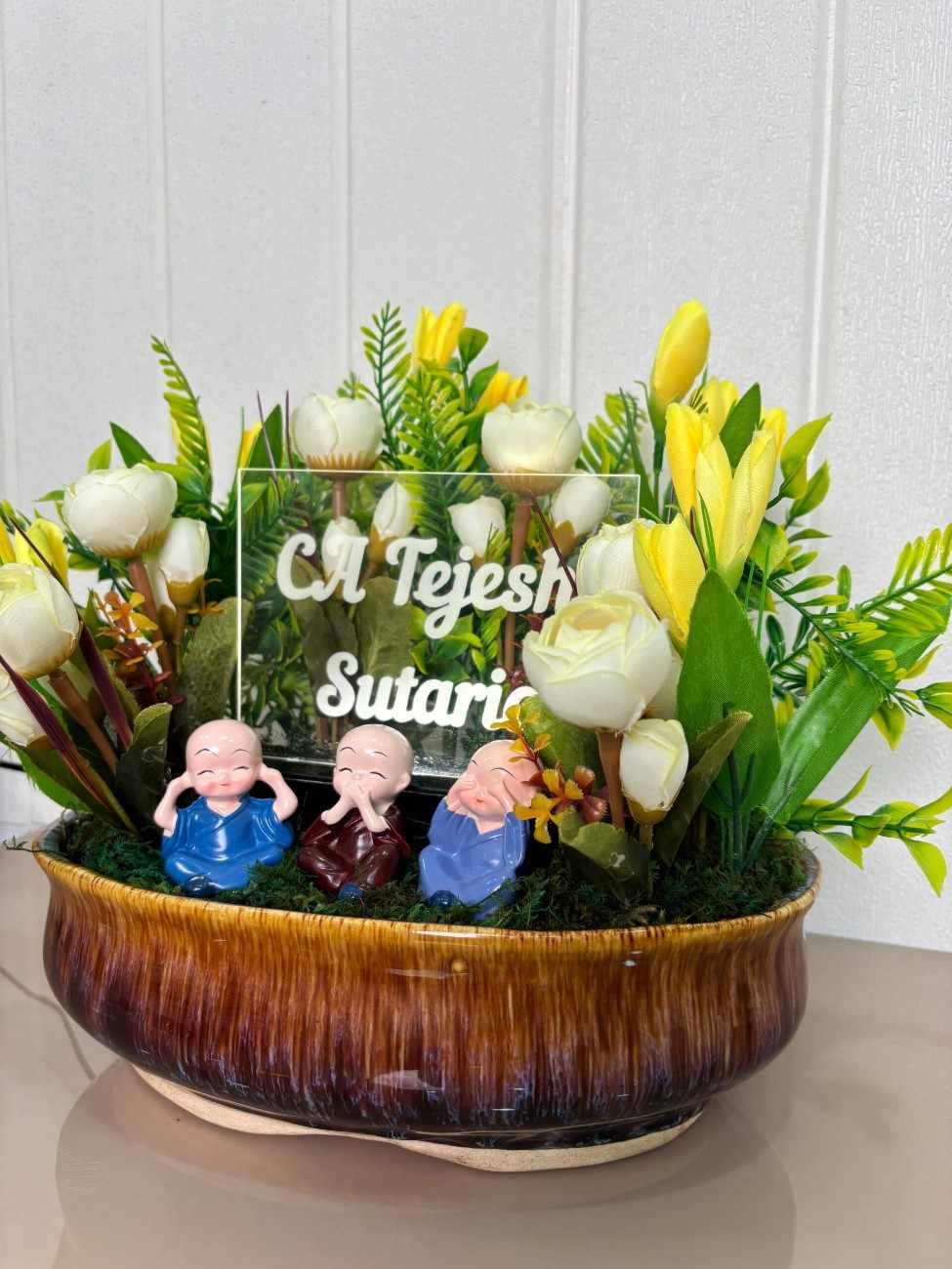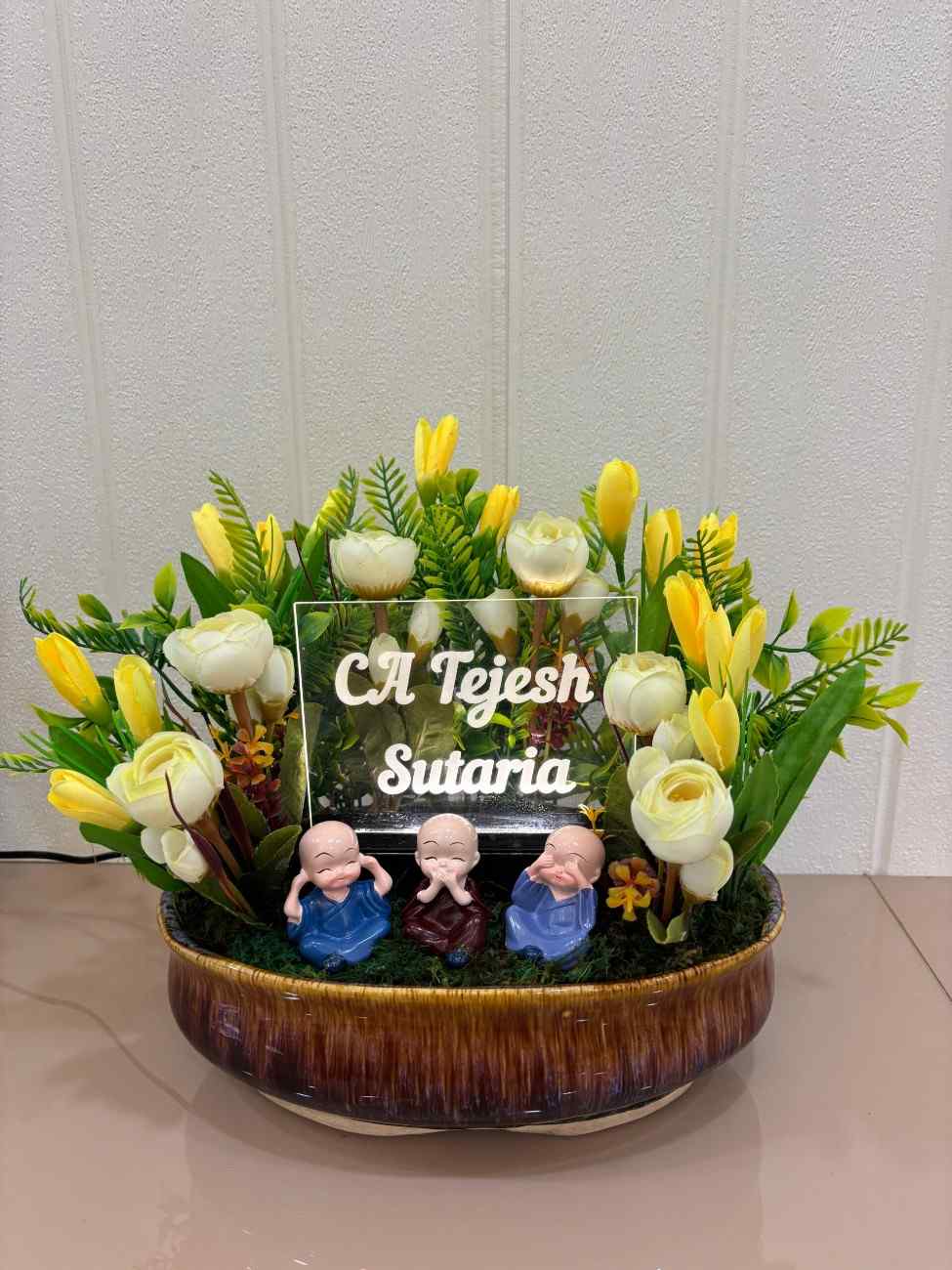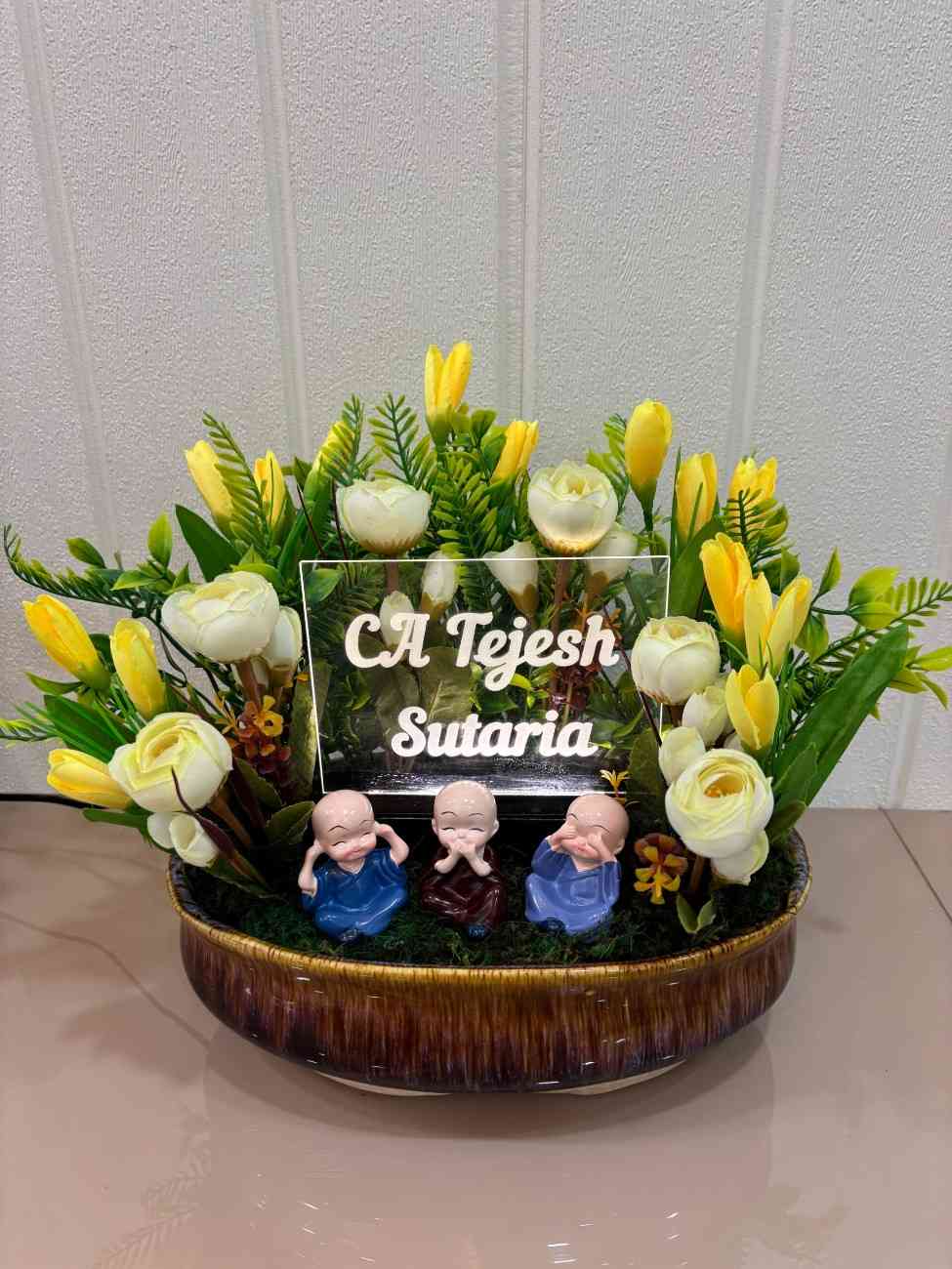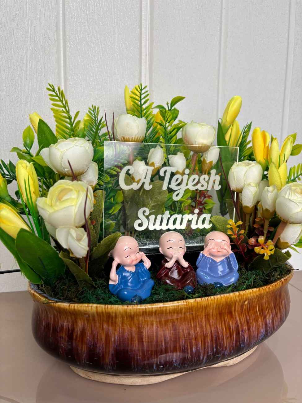 A charming and personalized artificial floral arrangement featuring three adorable ‘See No Evil, Hear No Evil, Speak No Evil’ monk figurines, surrounded by vibrant yellow and white flowers and lush greenery, presented in a rustic glazed ceramic pot with a customizable clear acrylic name plaque.