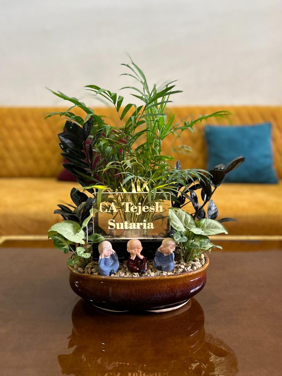 Create a peaceful oasis on any desk with this exquisite multi-plant planter featuring three adorable monk figurines and a personalized acrylic nameplate. A perfect blend of nature and serenity, ideal for bespoke corporate gifts or unique personal decor.