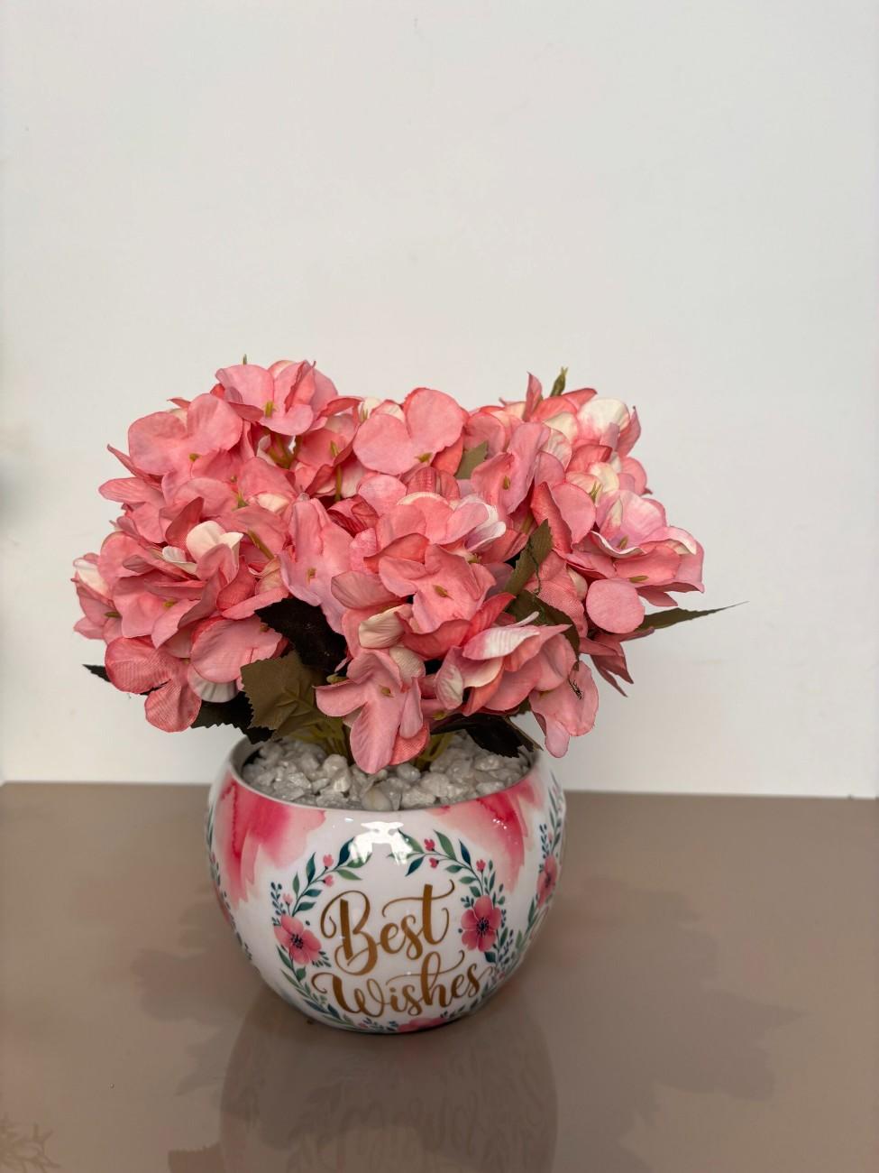 Add a touch of elegance and warmth to your space with this beautifully designed artificial flower arrangement. Featuring lifelike pink hydrangea-style blossoms, this decorative piece comes in a charming round ceramic pot with the words “Best Wishes” artistically inscribed on it.