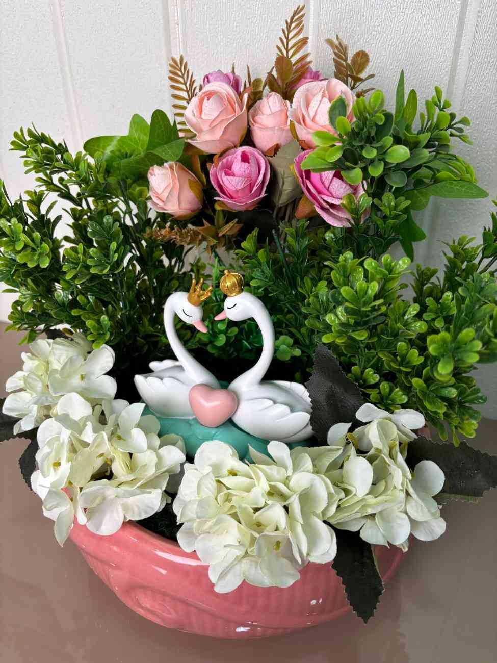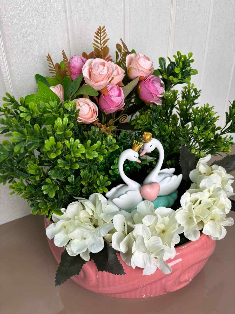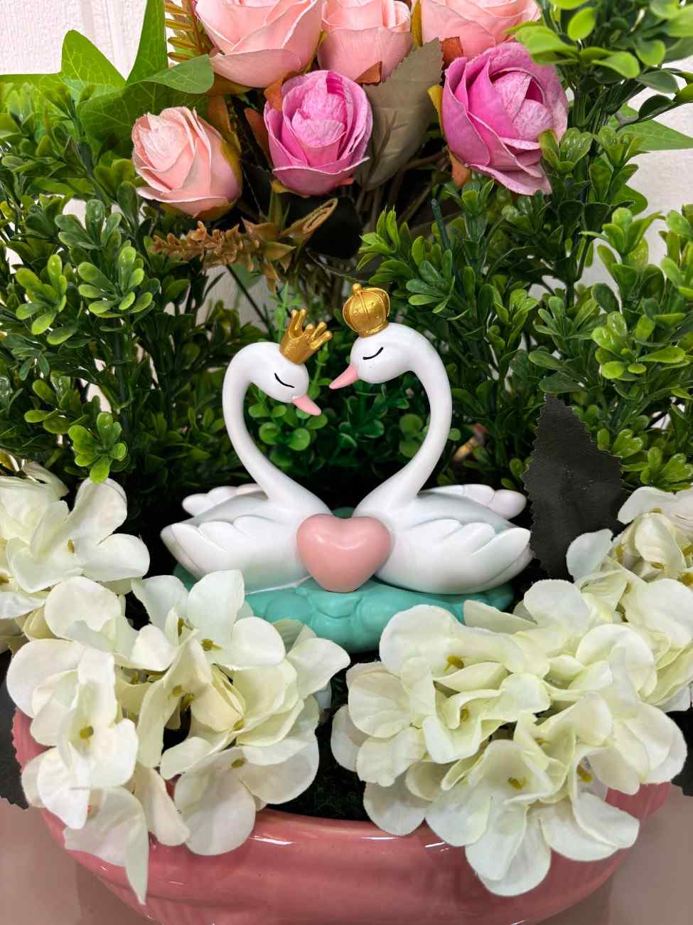 Celebrate love with this charming artificial floral arrangement featuring an elegant swan couple nestled among vibrant pink rosebuds, white tulips, and realistic green foliage. The adorable swans with tiny gold crowns sit atop a heart base, symbolizing romance and unity.