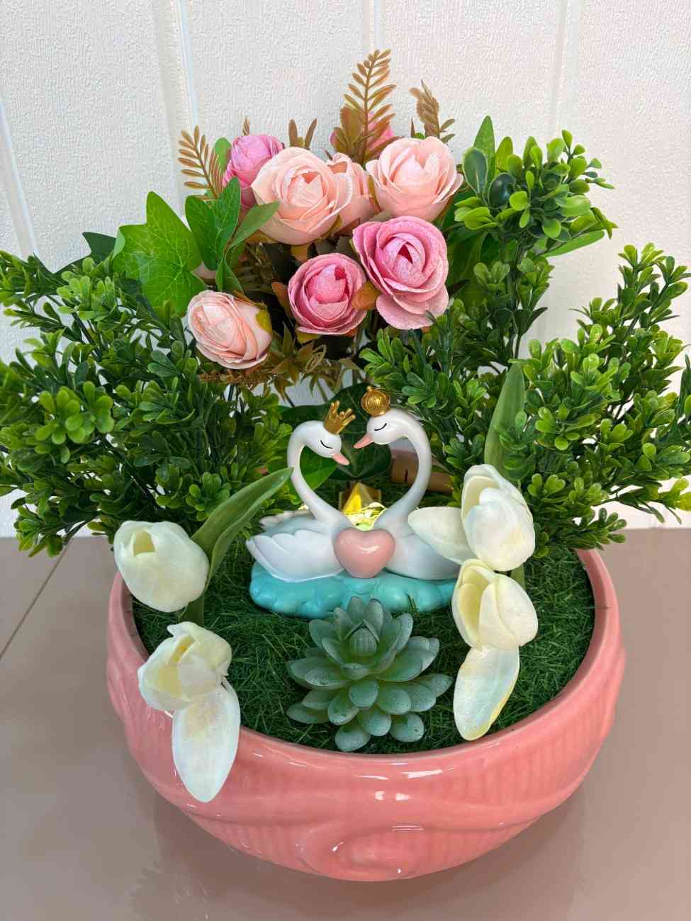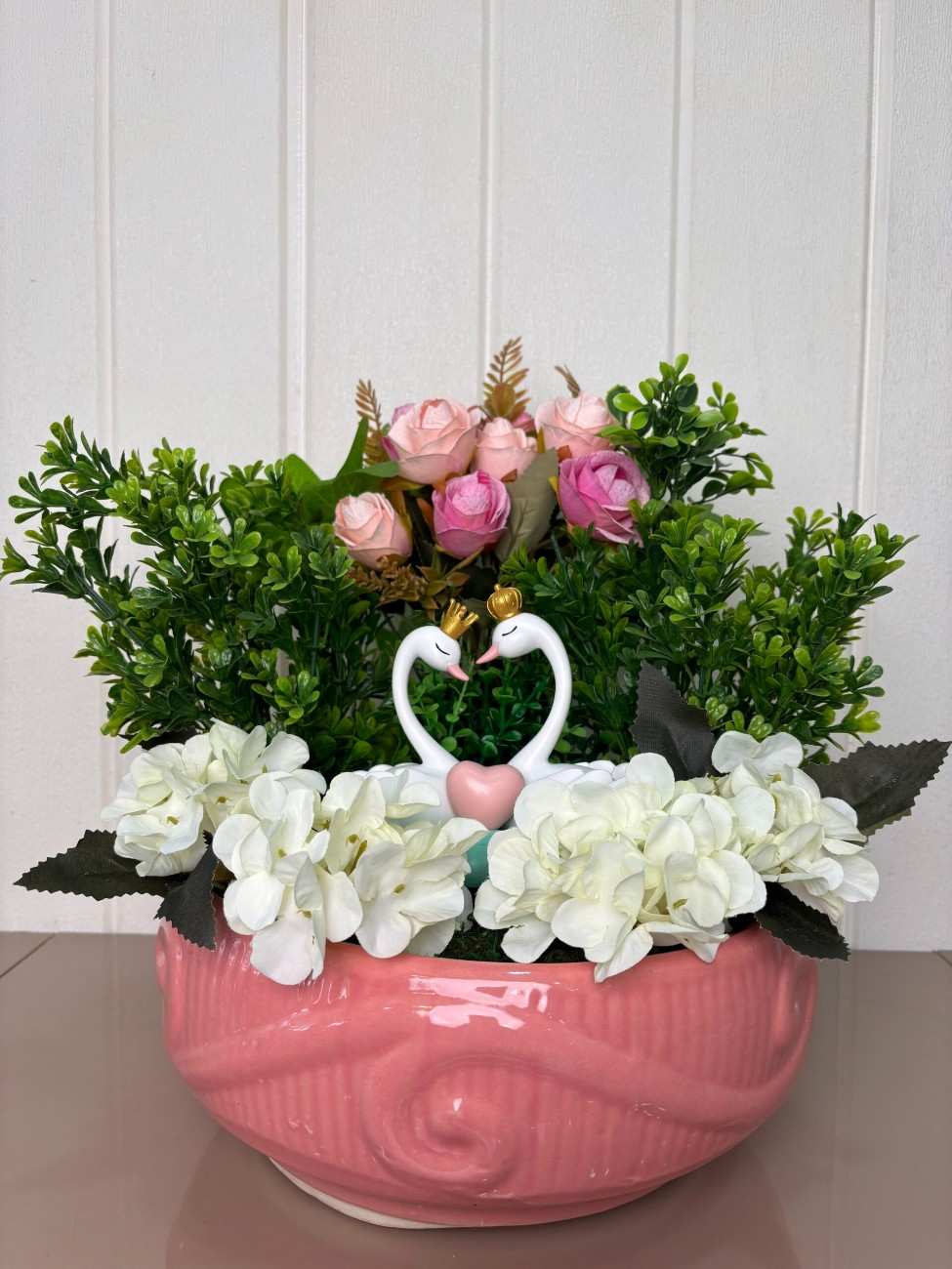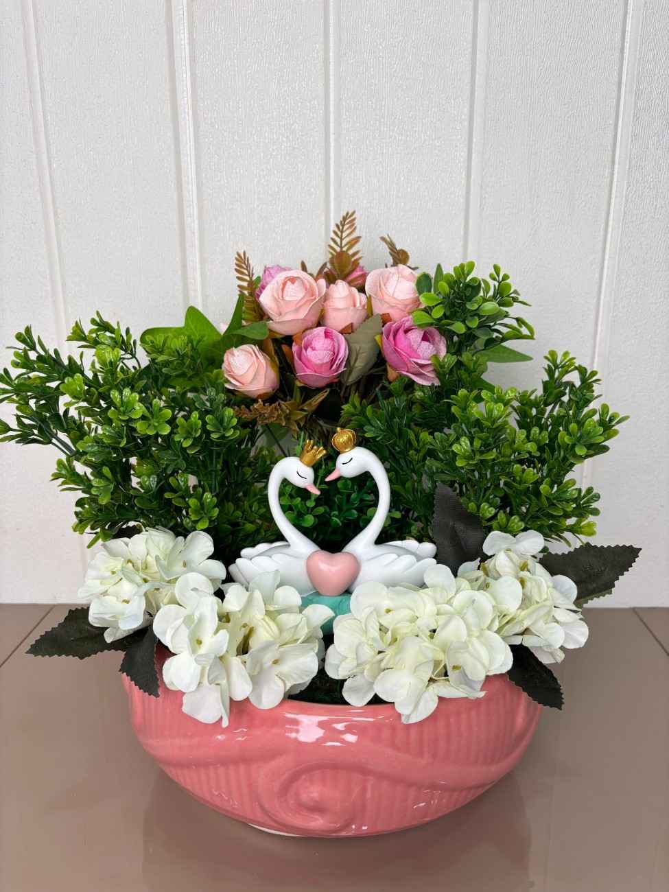 Celebrate love with this charming artificial floral arrangement featuring an elegant swan couple nestled among vibrant pink rosebuds, white tulips, and realistic green foliage. The adorable swans with tiny gold crowns sit atop a heart base, symbolizing romance and unity.