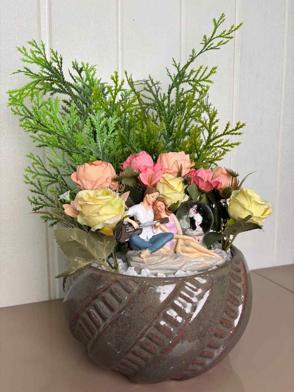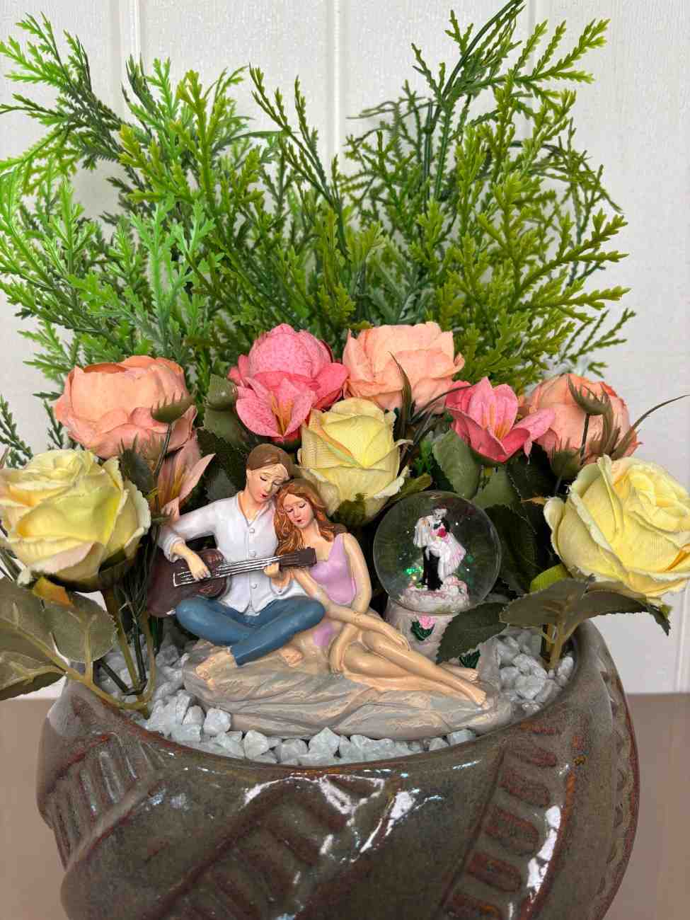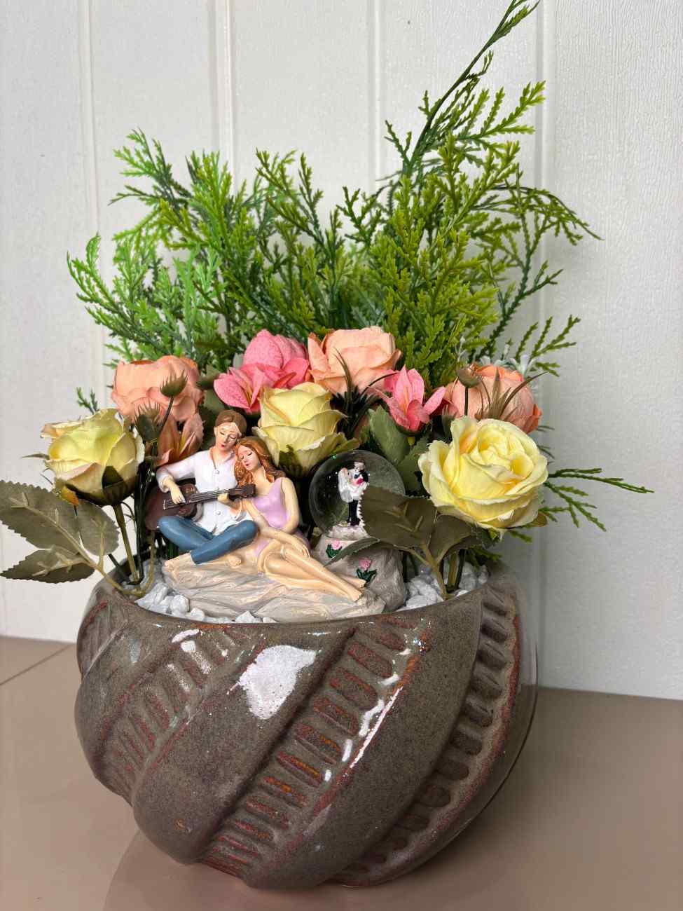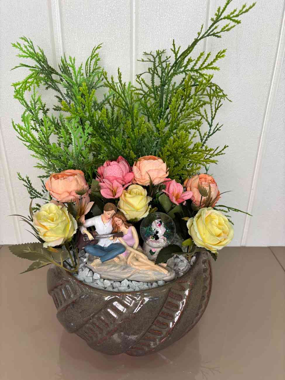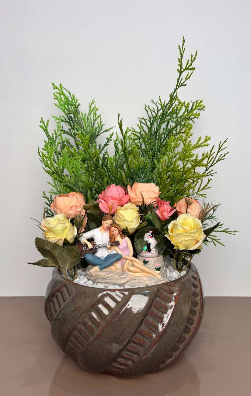 This heartwarming arrangement is set in a handcrafted brown ceramic pot with embossed detailing, filled with white pebbles for added elegance. The couple figurine, with the man playing the guitar and the woman resting by his side, creates a perfect romantic centerpiece for your living space, bedroom, or gifting occasions like anniversaries and Valentine’s Day.