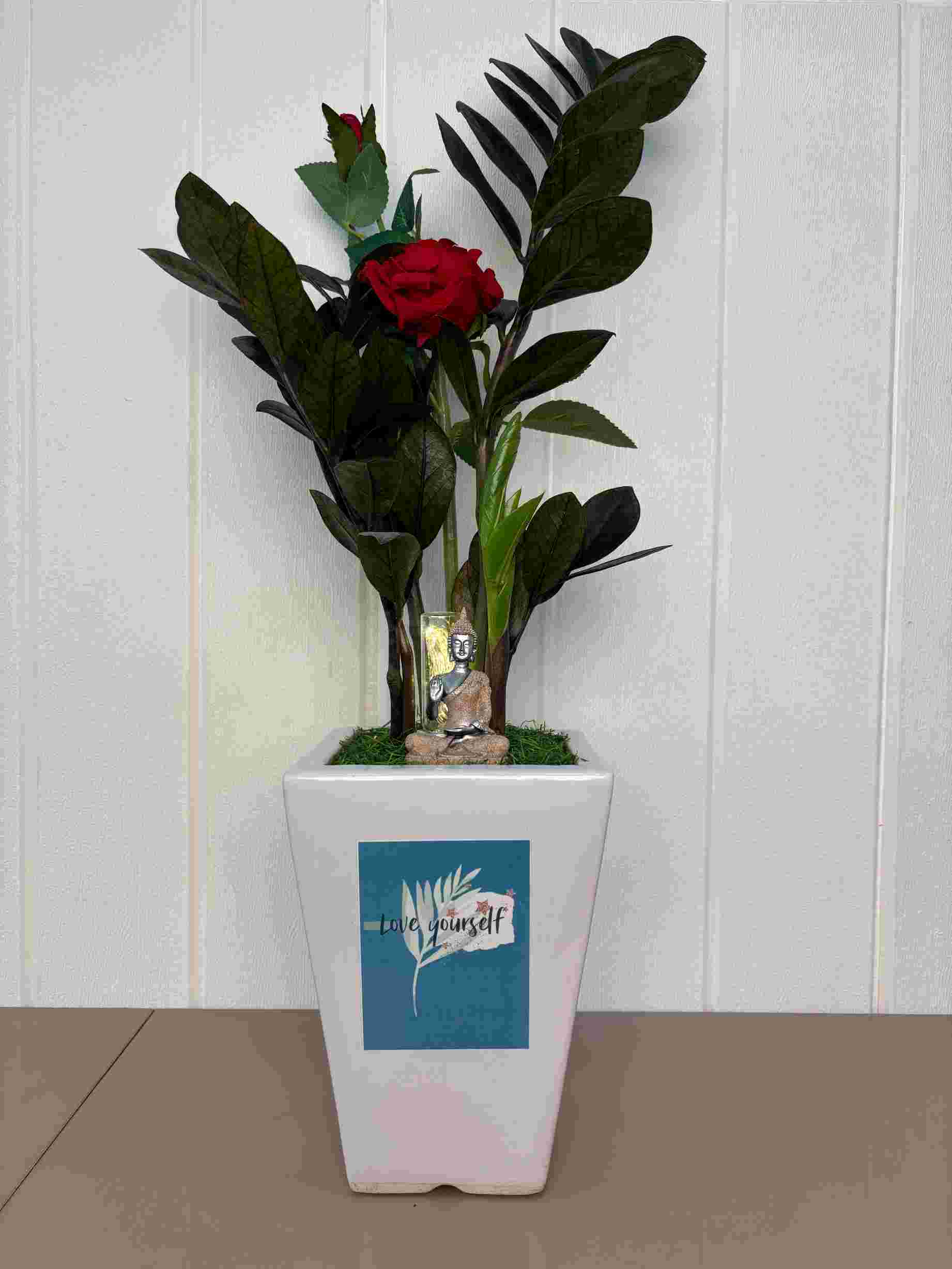 This elegant and meaningful planter is designed to inspire mindfulness and self-care. It combines the exotic beauty of the Black ZZ Plant with the timeless symbolism of a Buddha figure and the passionate touch of a red rose, creating a perfect accent for personal spaces or thoughtful gifting. The “love yourself” message serves as a daily reminder of self-affirmation.