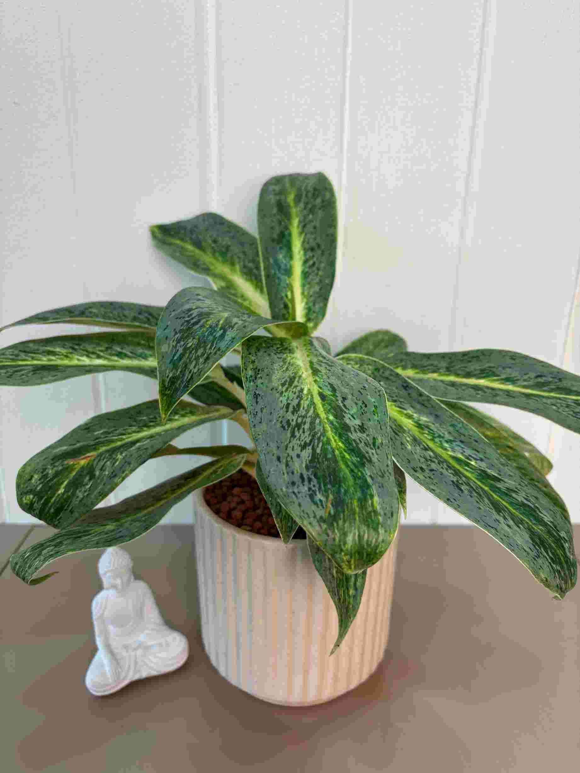 A beautiful and calming arrangement featuring a lush Aglaonema plant with striking variegated leaves, complemented by a serene white meditating Buddha, all in a modern ribbed ceramic pot