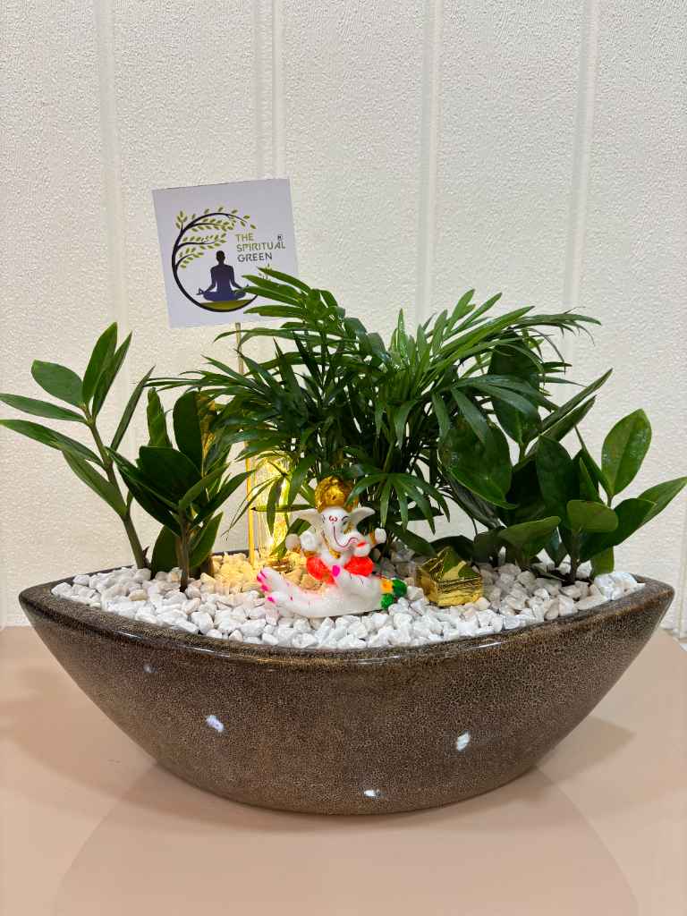 The planter features a delightful miniature idol of Lord Ganesha, seated peacefully, symbolizing wisdom, prosperity, and the remover of obstacles. He is nestled amidst a lush landscape of live plants, including the graceful, feathery fronds of an Areca Palm and the robust, dark green leaves of a ZZ Plant (Zamioculcas zamiifolia). These low-maintenance plants are known for their air-purifying qualities and ability to thrive indoors.