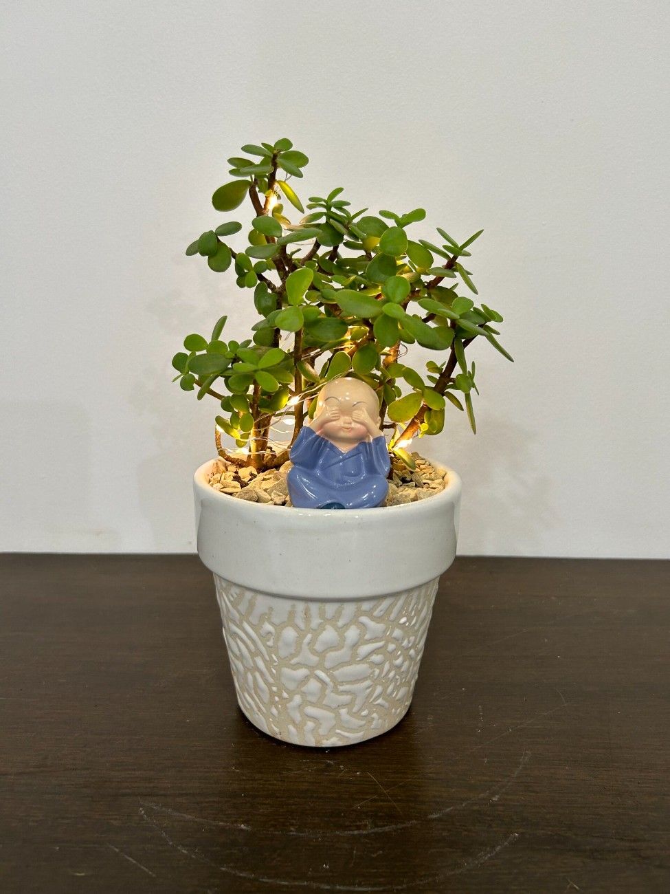 A Symbol of Prosperity and Serenity: Our Serene Jade Plant with Monk Figurine and Fairy Lights is designed to add a touch of tranquility and good fortune to any home or office environment. The Jade plant (Crassula ovata), often known as the “Money Plant” or “Good Luck Plant,” is cherished for its vibrant green leaves and symbolic association with wealth and prosperity.