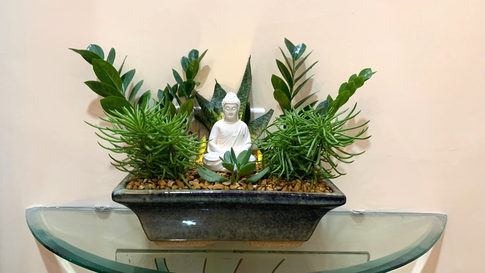 The garden includes a diverse selection of plants such as variegated Pothos (money plant), ZZ plant (Zamioculcas zamiifolia), a delicate succulent, and a dwarf Schefflera, all meticulously arranged in a broad, speckled dark grey ceramic bowl and adorned with natural pebbles. The striking yellow robe of the Buddha stands out beautifully against the varied greens of the foliage.