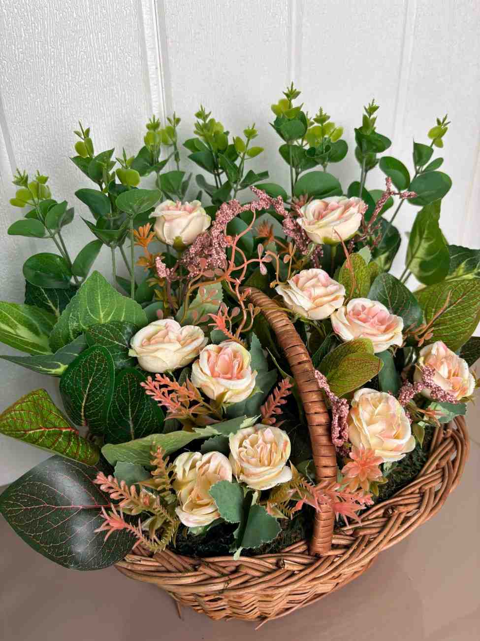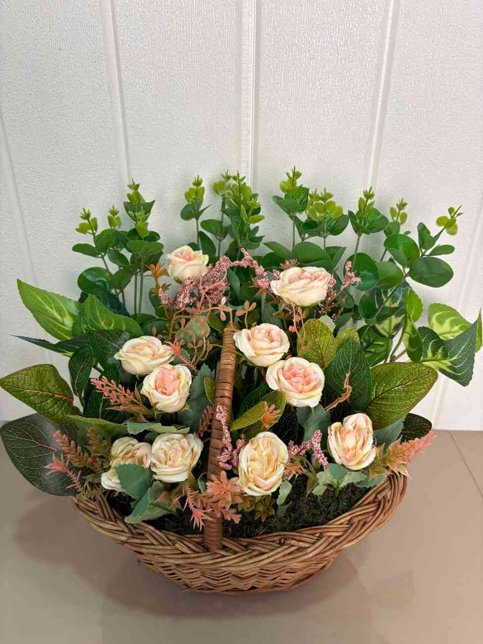 Embrace a gentle aesthetic with this beautiful artificial floral arrangement. It showcases a cluster of soft peach-hued roses, radiating warmth and tranquility. These charming blooms are complemented by a generous assortment of realistic green foliage, including broad leaves and tall eucalyptus-like stems, along with delicate pink-toned filler accents, creating a rich and layered look. The entire display is artfully arranged in a sturdy, natural woven basket with a handle, making it a complete and ready-to-display decorative piece. This low-maintenance arrangement is ideal for adding a touch of sophisticated calm to living rooms, bedrooms, offices, or as a thoughtful and lasting gift.