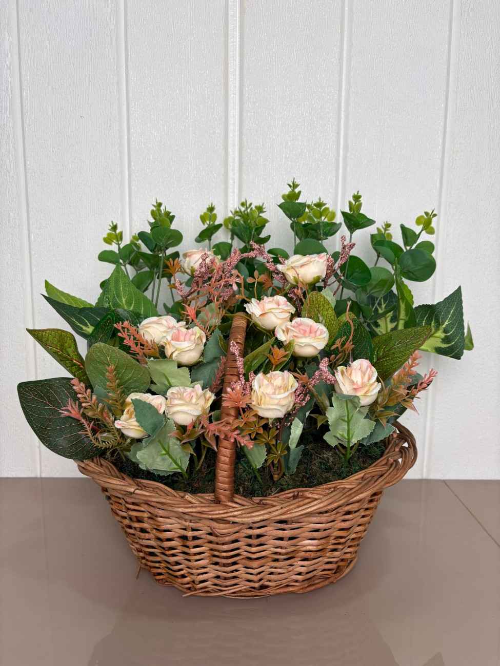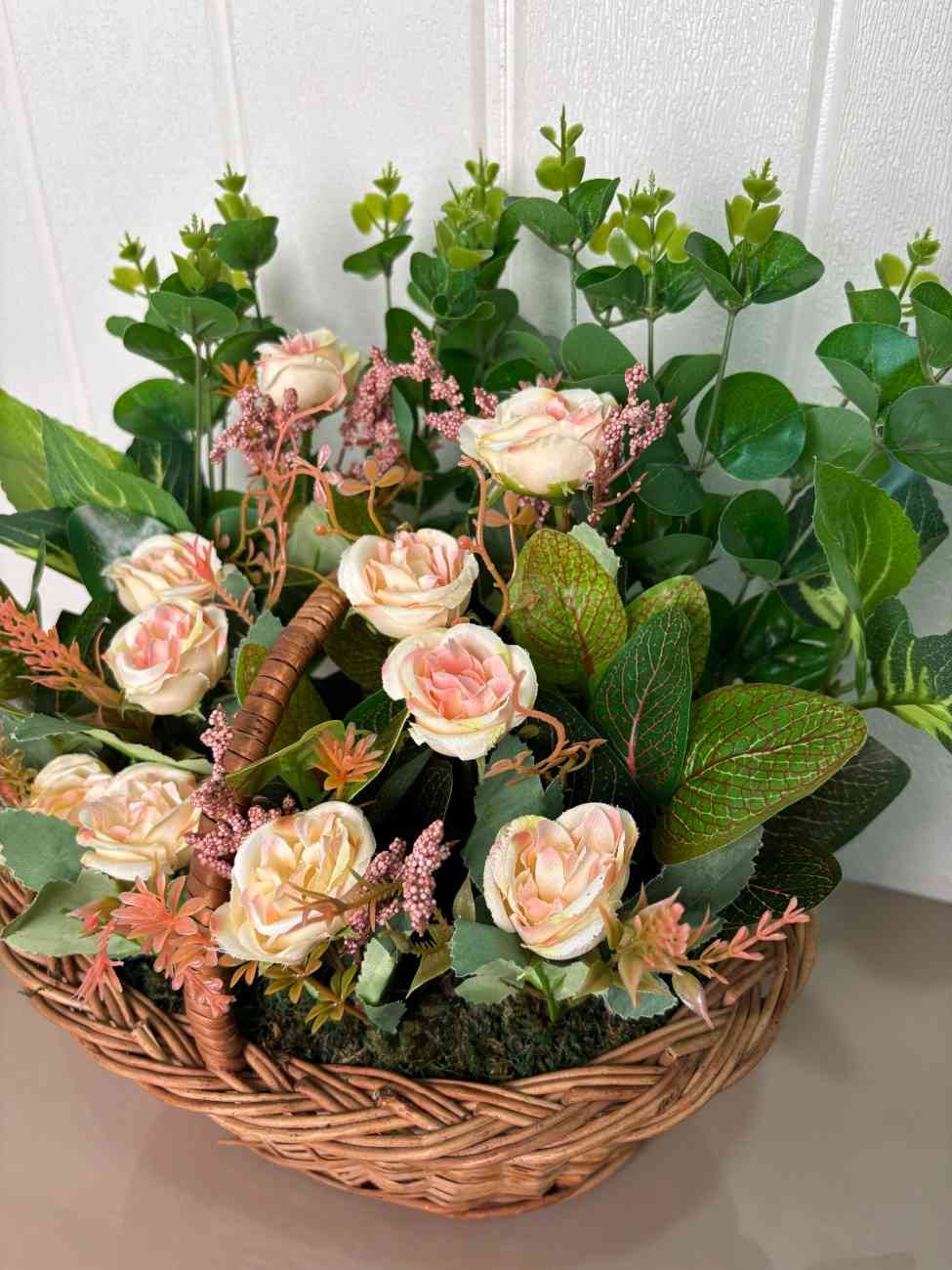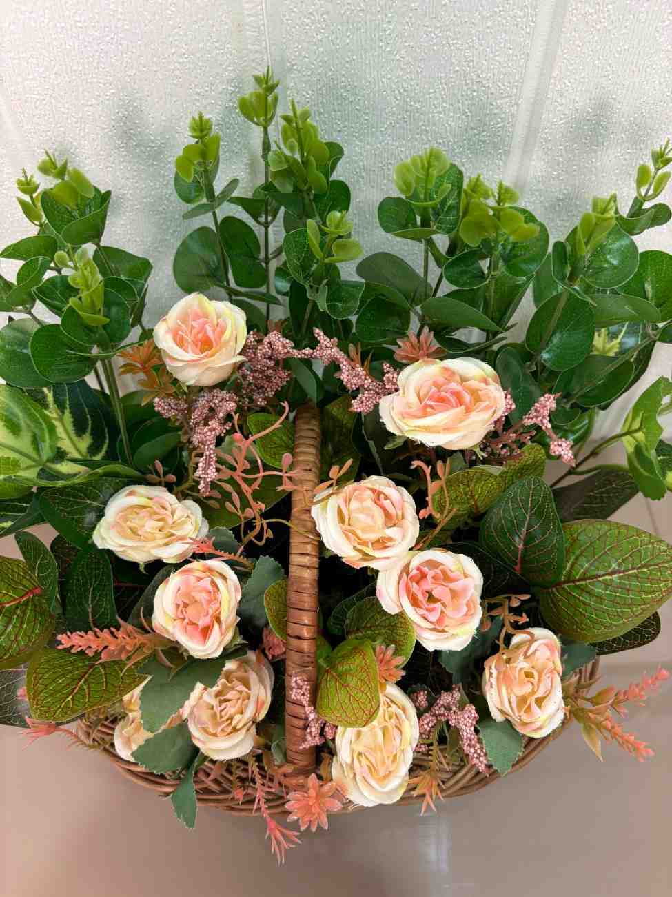 Be the first to review “Soft Peach & Green Artificial Rose Basket”