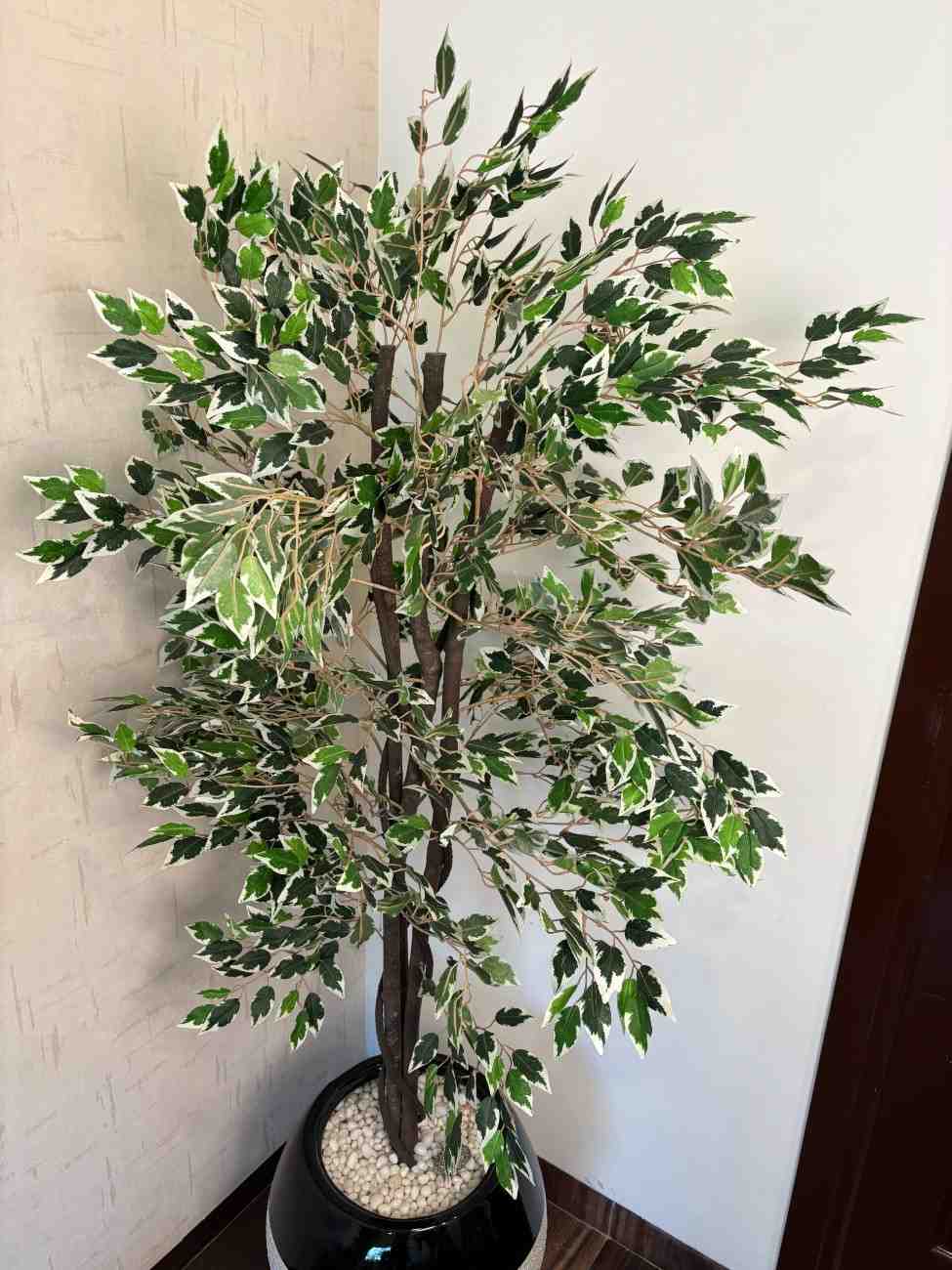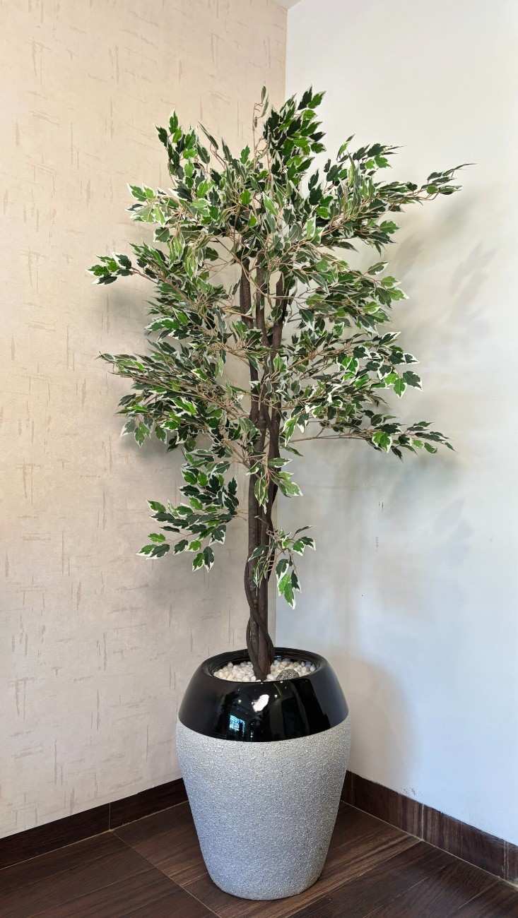The tree is securely potted in a stylish and contemporary two-tone ceramic planter. The lower section of the pot features a matte light grey textured finish, while the upper rim is a glossy black, creating a chic contrast that complements various decor styles. Small white decorative pebbles fill the top of the pot, completing the natural look. Ideal for living rooms, offices, lobbies, or any area where you want to make a statement with greenery, this artificial Ficus tree offers lasting beauty and a refreshing ambiance year-round.